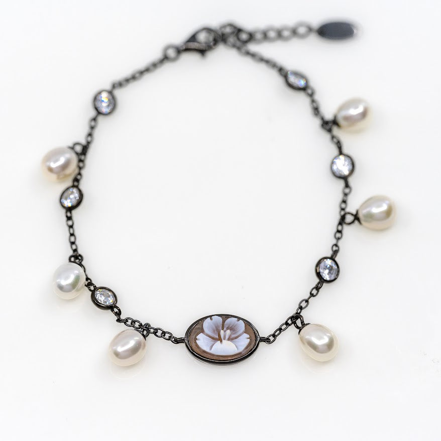 Cameo Italiano Arianna Fiori bracelet bezel set with one hand carved shell featuring a single flower motif, on an adjustable 16 to 18 inch cable chain that is directly attached to the pendant. This piece also features alternating fresh water pearl drops and cubic zirconia that are bezel set and attached to the chain.