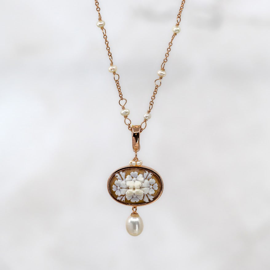 Cameo Italiano Anastasia pendant bezel set with a hand carved bouquet of flowers and adorned with a ring of seed pearls around the bail and a juicy pearl drop. The delicate pearls of the elements chain adds such character for a gorgeously classic look.