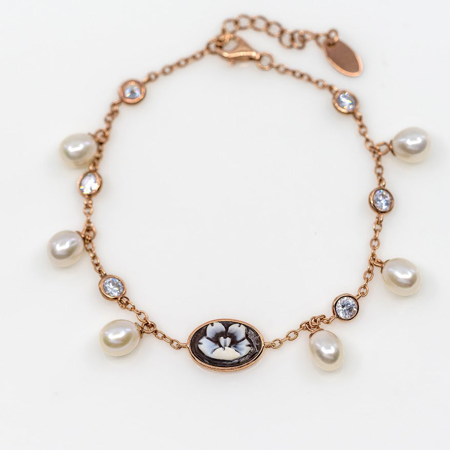 Cameo Italiano Arianna Fiori bracelet bezel set with one hand carved shell featuring a single flower motif, on an adjustable 16 to 18 inch cable chain that is directly attached to the pendant. This piece also features alternating fresh water pearl drops and cubic zirconia that are bezel set and attached to the chain.