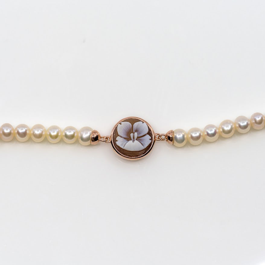 Cameo Italiano Ballet bracelet bezel set with a hand carved shell featuring a single flower motif, on an adjustable strand of hand strung freshwater pearls. The back of the cameo features a floral design cut out, so that if it flips, it's still fashionable!