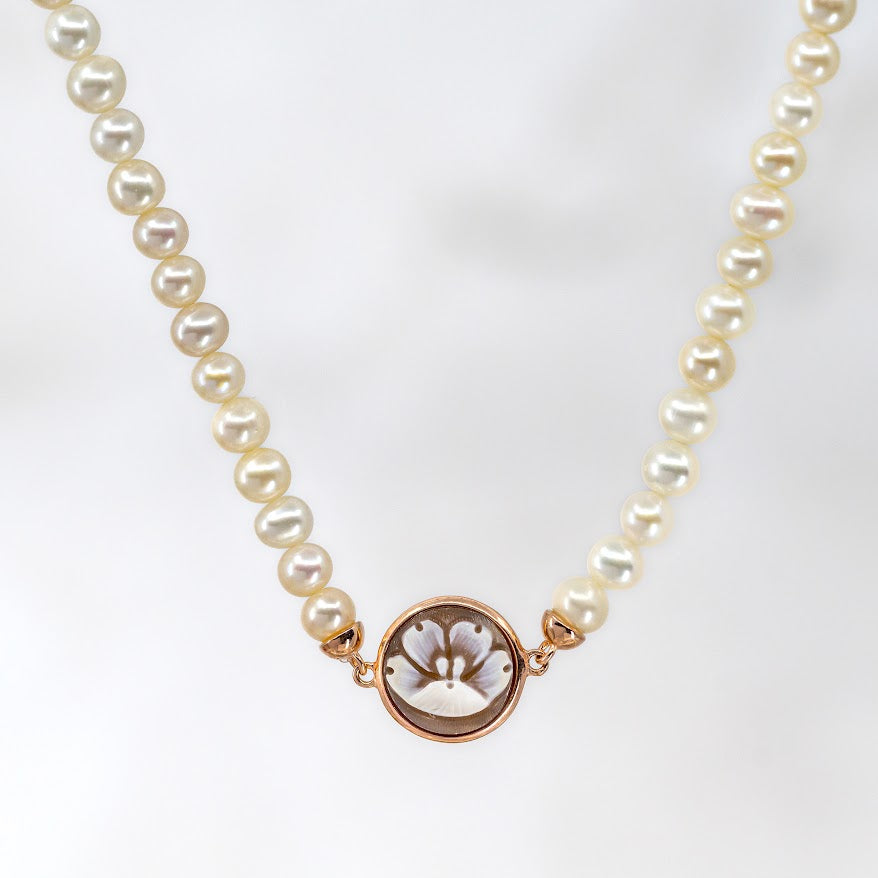 Cameo Italiano Ballet choker bezel set with a hand carved shell featuring a single flower motif, on an adjustable 14 to 16 inch hand strung freshwater pearls. The back of the cameo features a floral design cut out, so that if it flips, it's still fashionable!