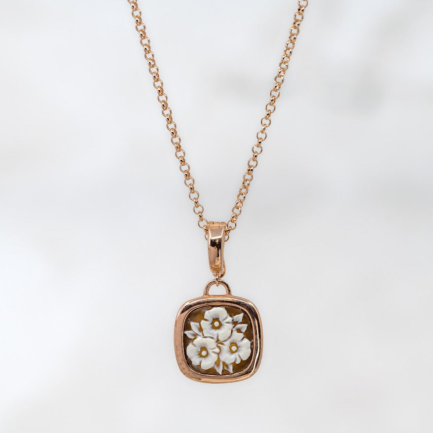 Cameo Italiano Classica pendant bezel set with a hand carved shell featuring a triple flower motif, on an adjustable 16 to 18 inch medium rolo chain