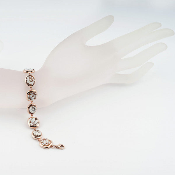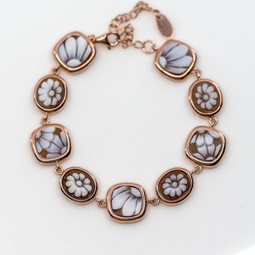 Cameo Italiano Classica Gardenia bracelet bezel set with hand carved shells featuring alternating flower motifs, each connected to the other and adjustable in length.
