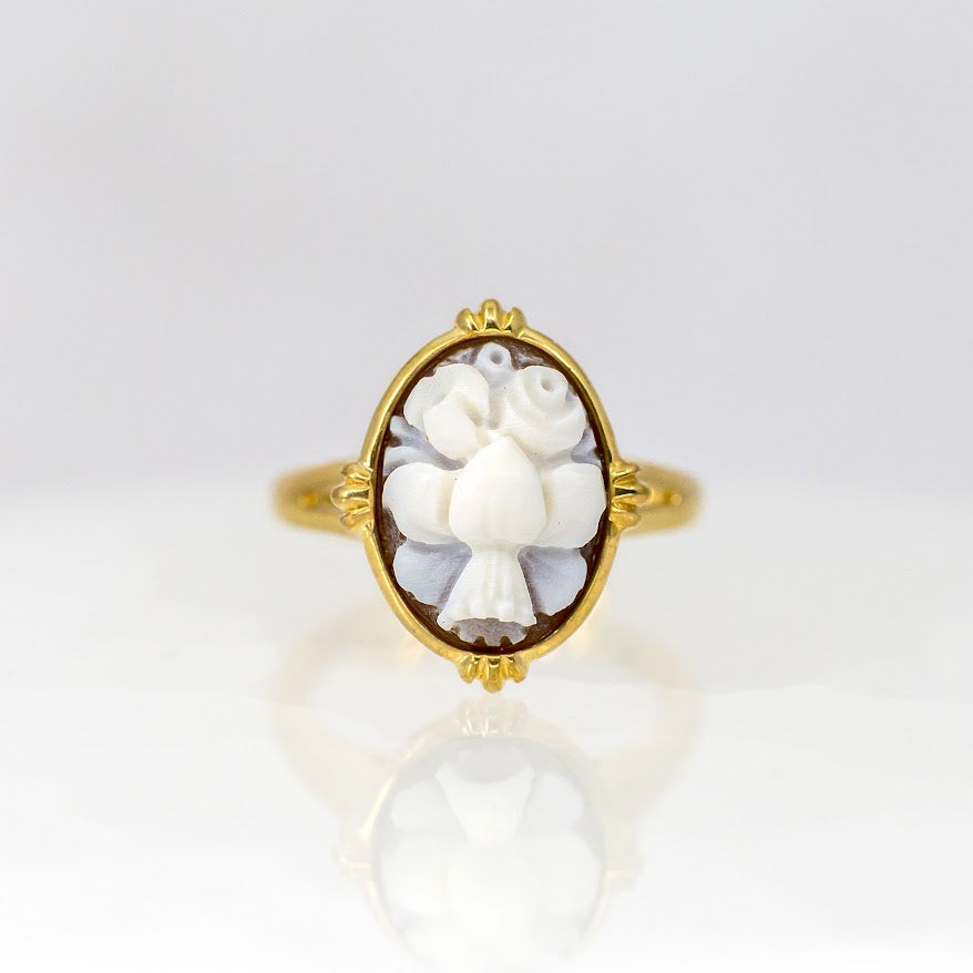 Cameo Italiano Luci ring bezel set with a hand carved shell in the motif of a flower bouquet and triple claws on the NESW points. This ring has self adjustable sizing up or down!