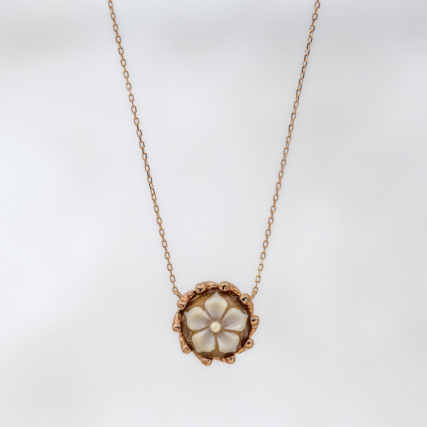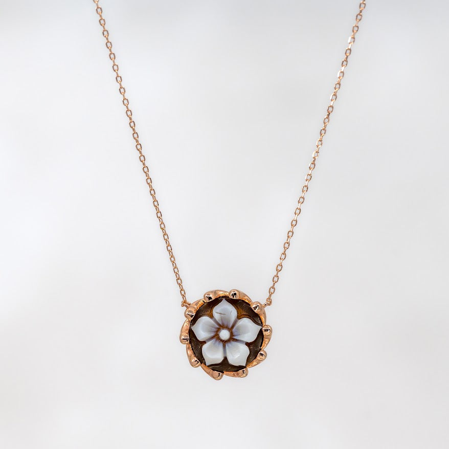 Cameo Italiano Sacred Fiori necklace bezel set with a hand carved shell featuring a single flower motif, on an adjustable 16 to 18 inch diamond cut cable chain that is directly attached to the pendant.