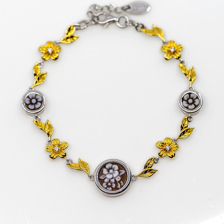 Cameo Italiano Luci Fiori bracelet set with cubic zirconia and hand carved cameos featuring both single and double flower cluster motif. Each CZ is set on a gold flower with leaf and petal designs.