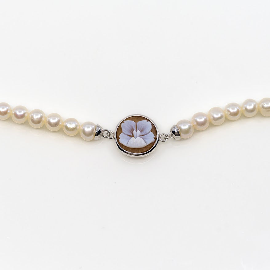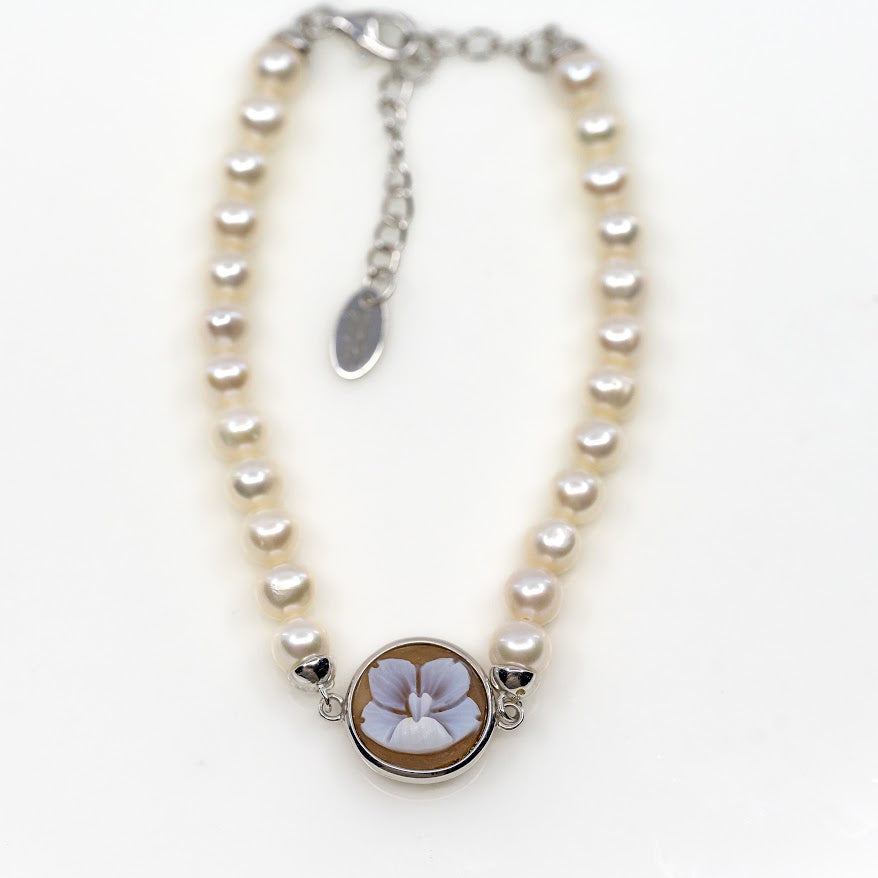 Cameo Italiano Ballet bracelet bezel set with a hand carved shell featuring a single flower motif, on an adjustable strand of hand strung freshwater pearls. The back of the cameo features a floral design cut out, so that if it flips, it's still fashionable!