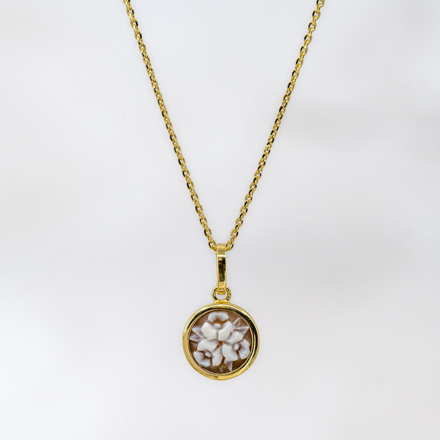 Cameo Italiano little Romantica pendant bezel set with a hand carved shell featuring a motif of a three flowers, on an adjustable 16 to 18 inch diamond cable chain. This piece also pairs well with the pearl elements chain in yellow as well.