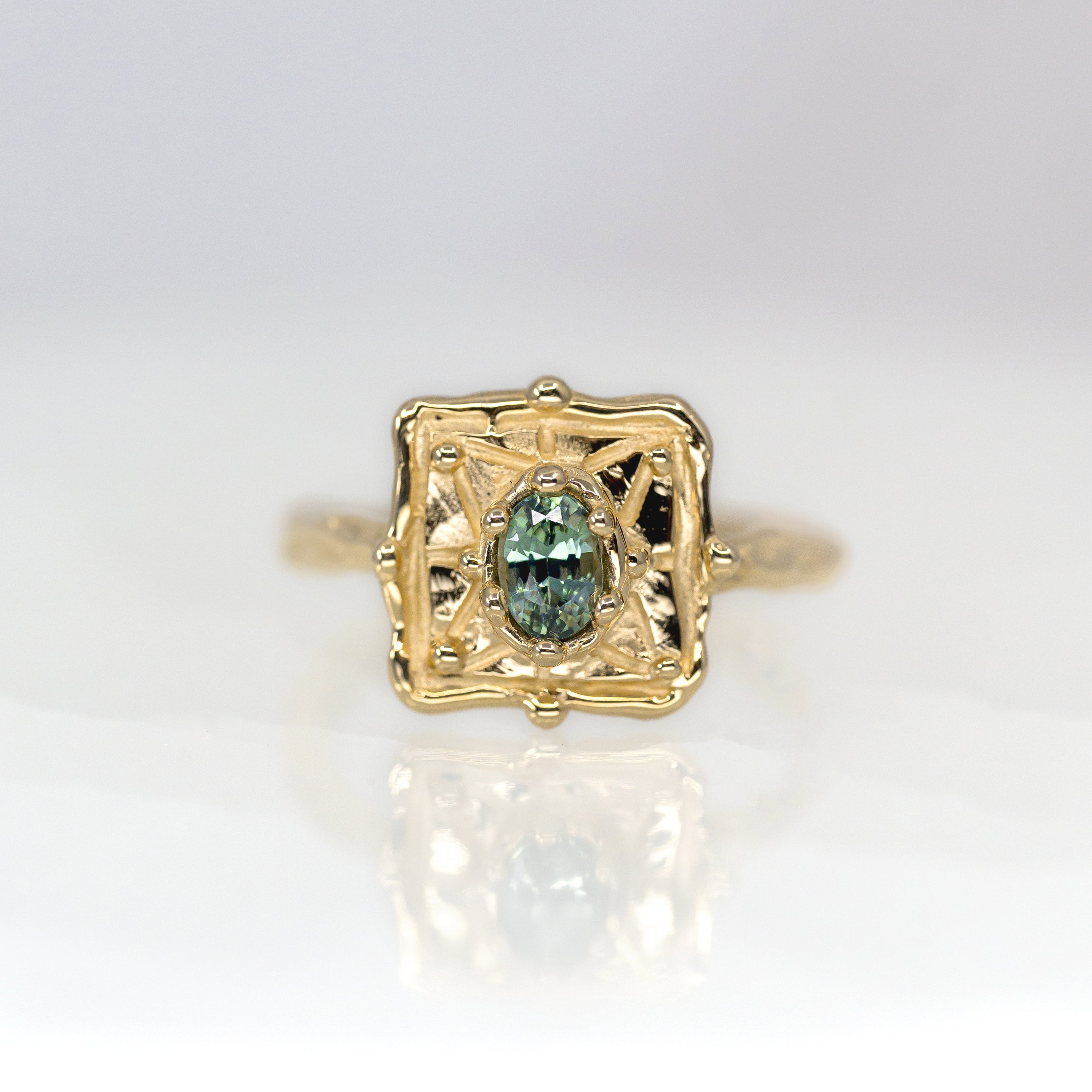 Emma Glover Ancient Star Sapphire Ring, set with one oval teal sapphire with an organic hand carved texture and band.