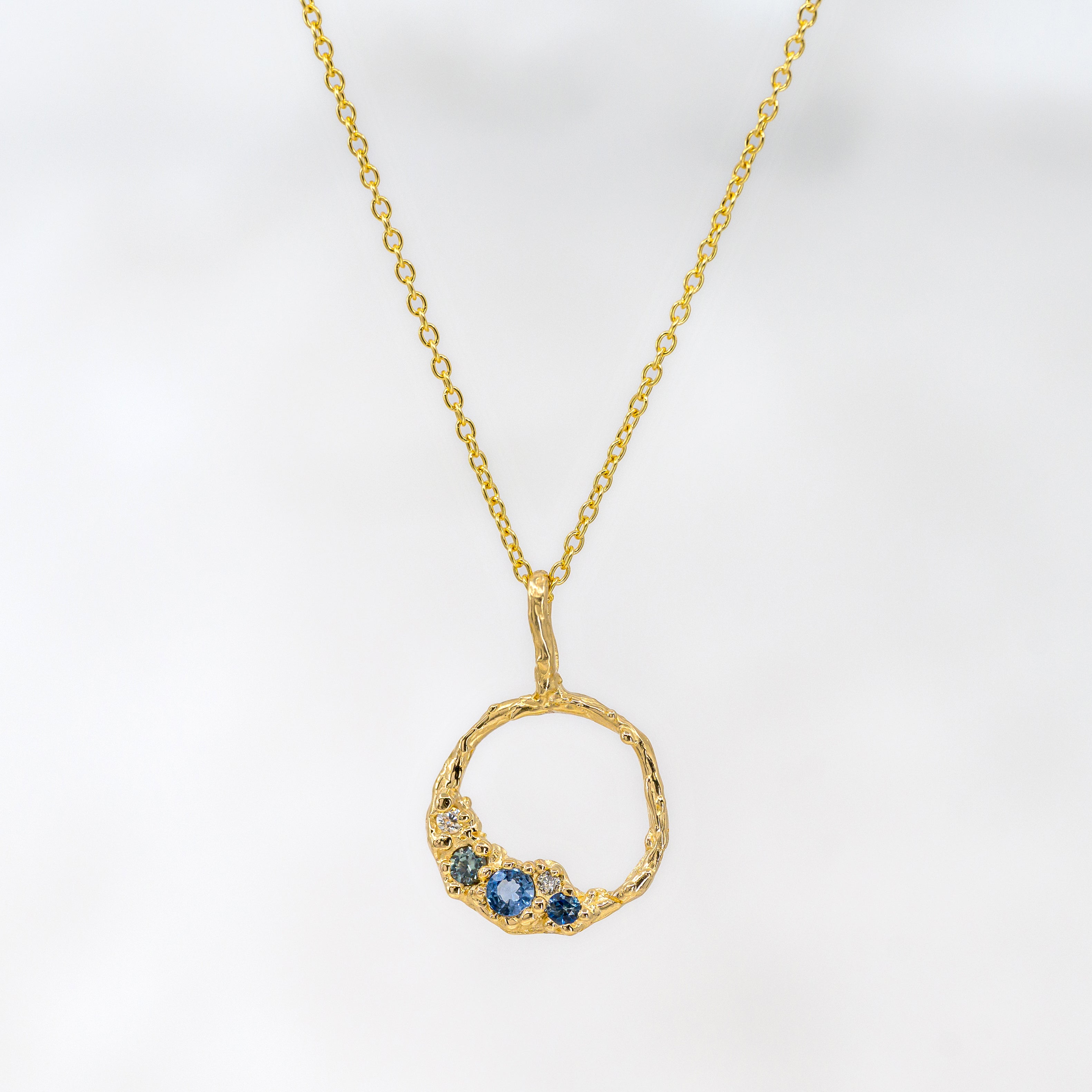 Emma Glover Mermaid Moonglow necklace, set with four teal-blue sapphires and one brilliant round diamond, with hand-carved texture on an open cable chain.