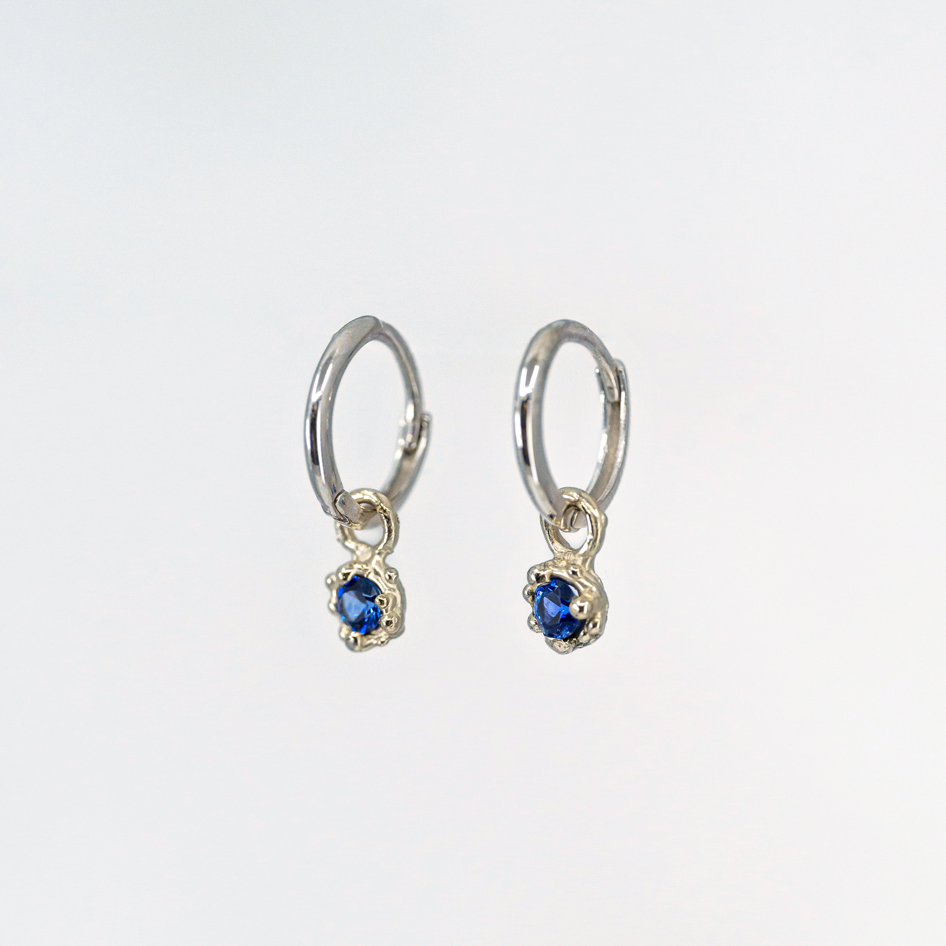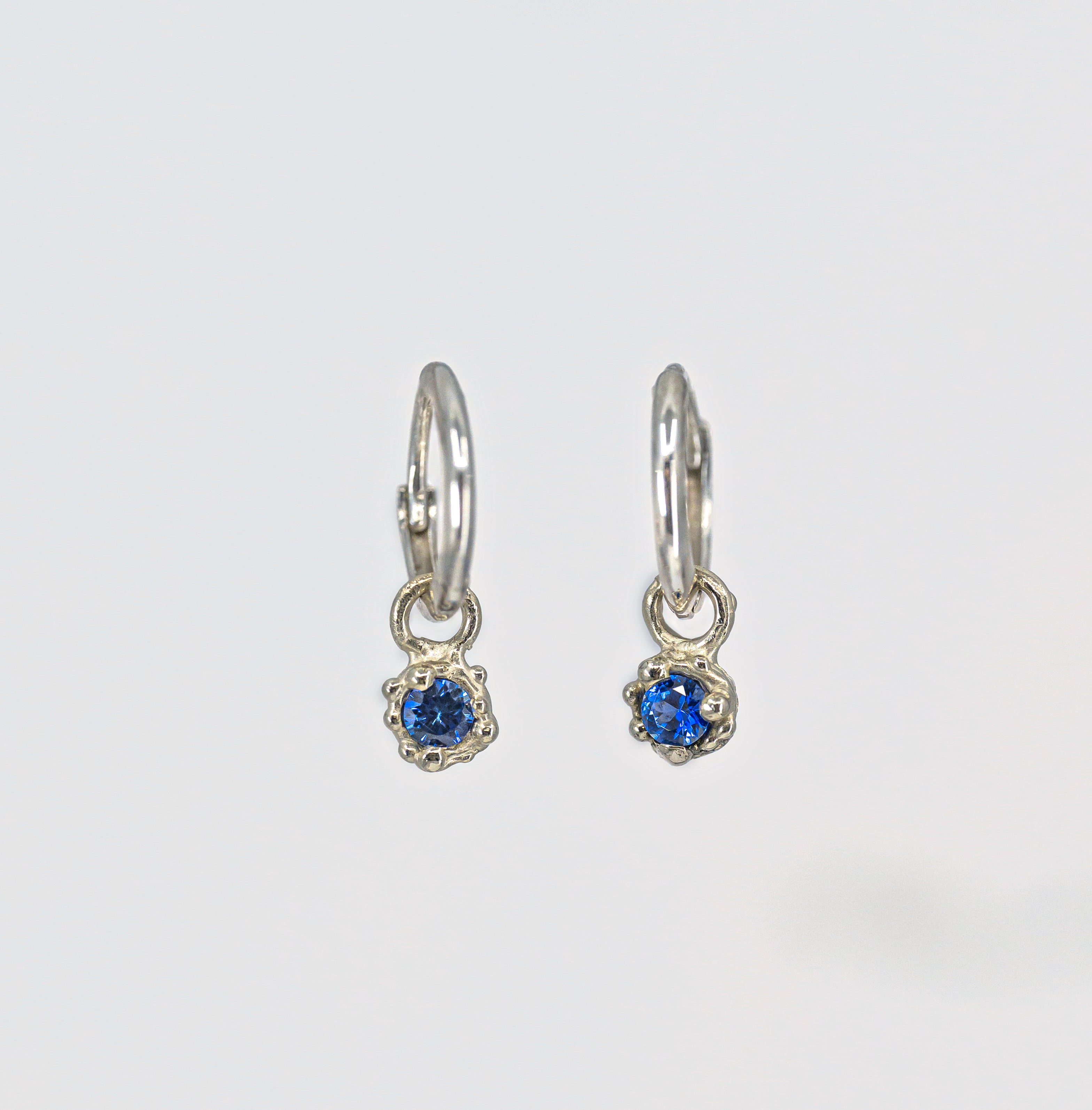 Emma Glover Mermaid Treasure huggie earrings with removable enhancer, set with brilliant cut blue round sapphires, with hand-carved texture.