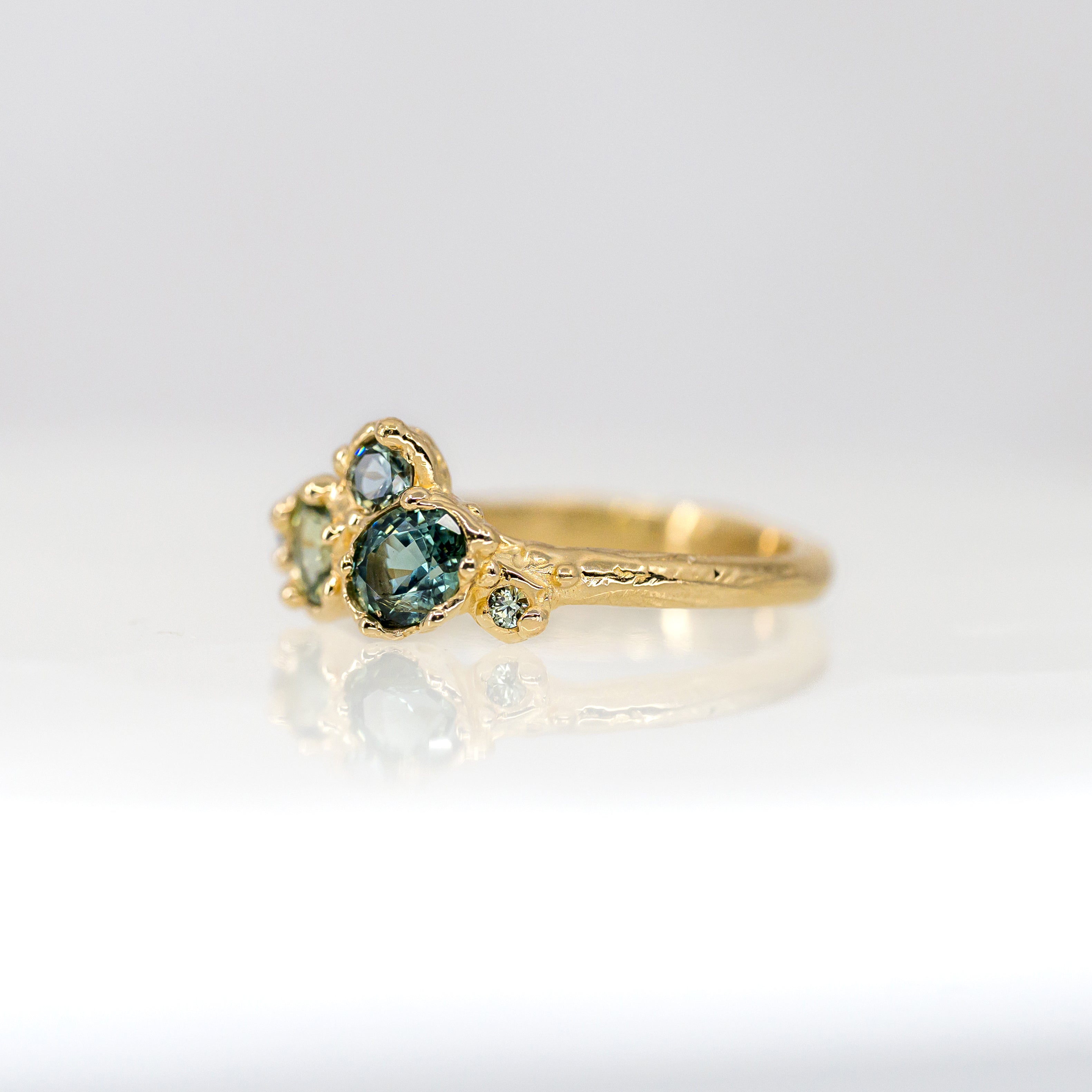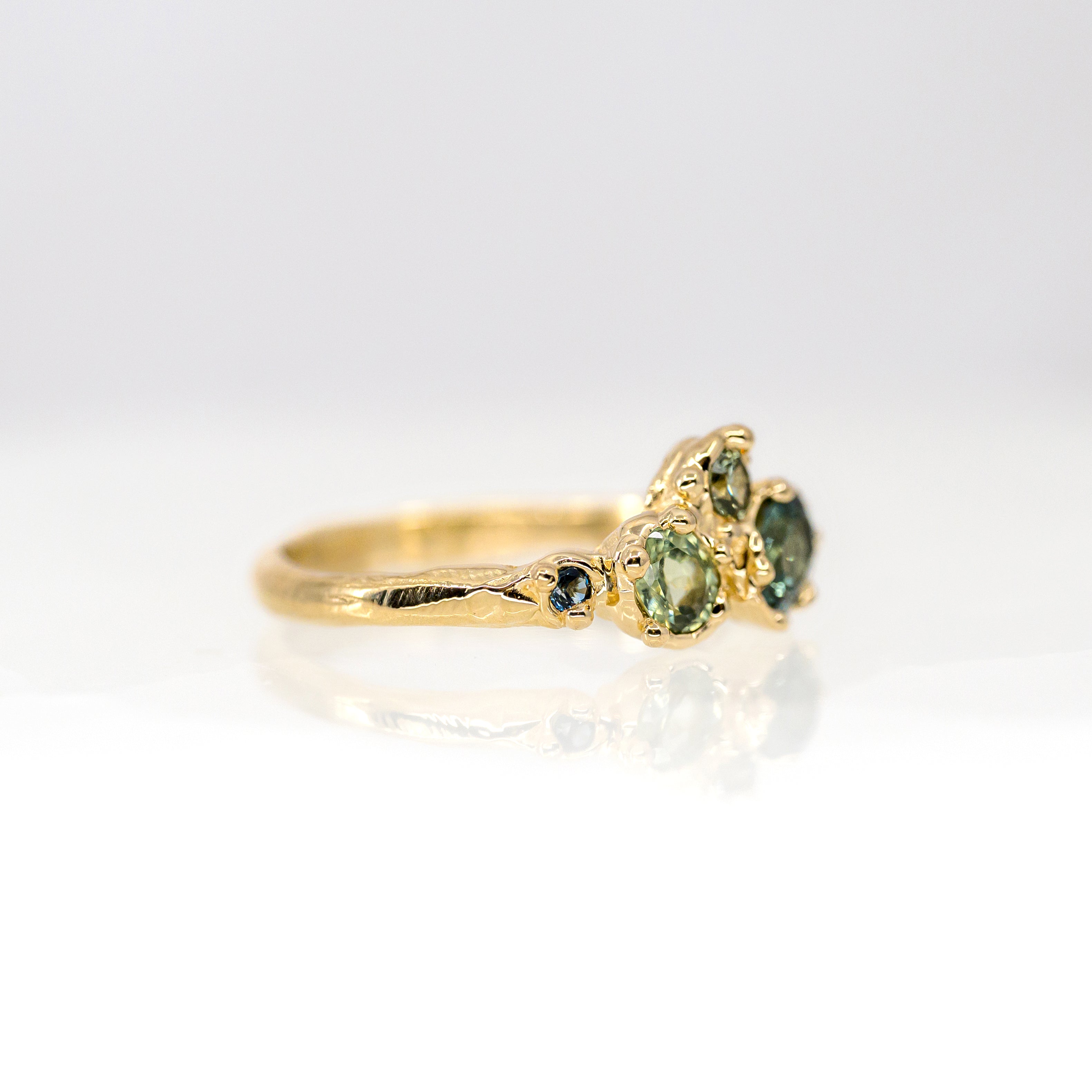 Emma Glover Mermaid Treasure ring set with five blue-green sapphires, with hand-carved texture.