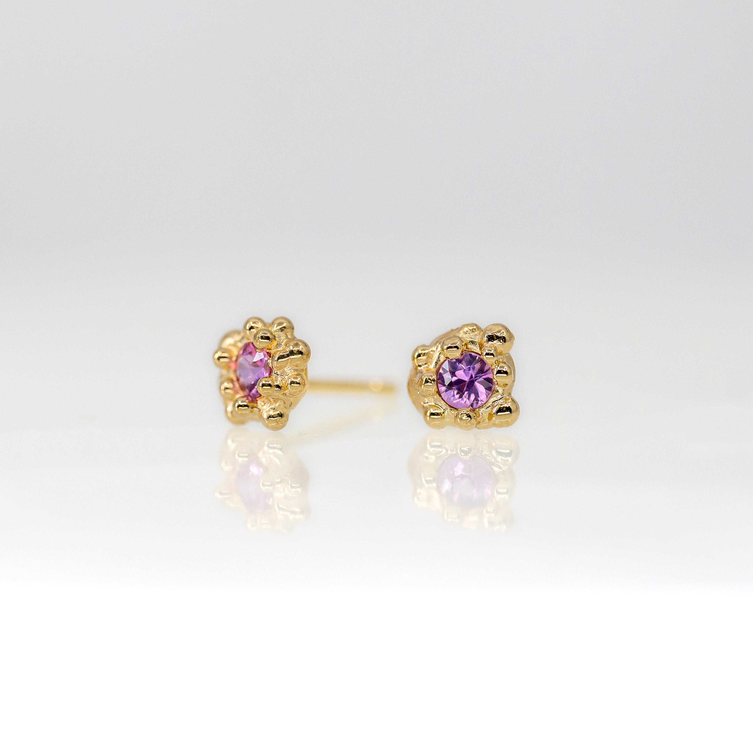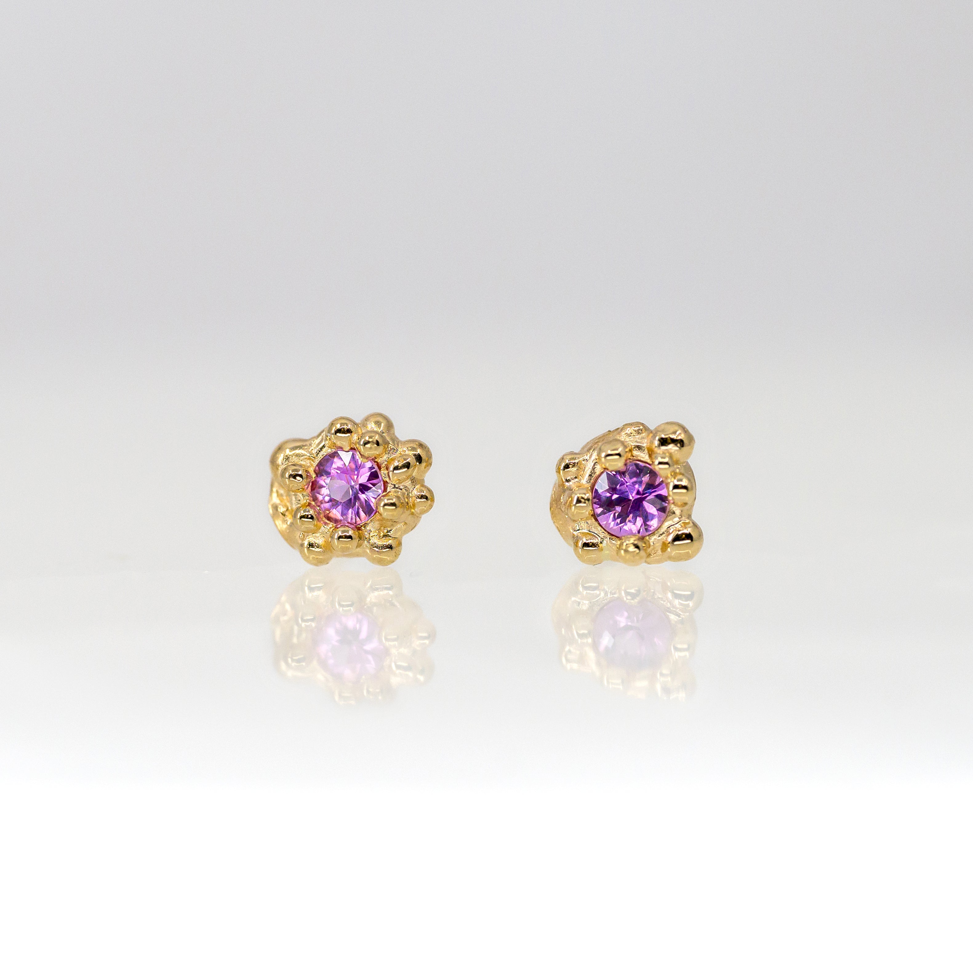 Emma Glover Mermaid Treasure stud earrings, set with brilliant cut pink round sapphires, with hand-carved texture.