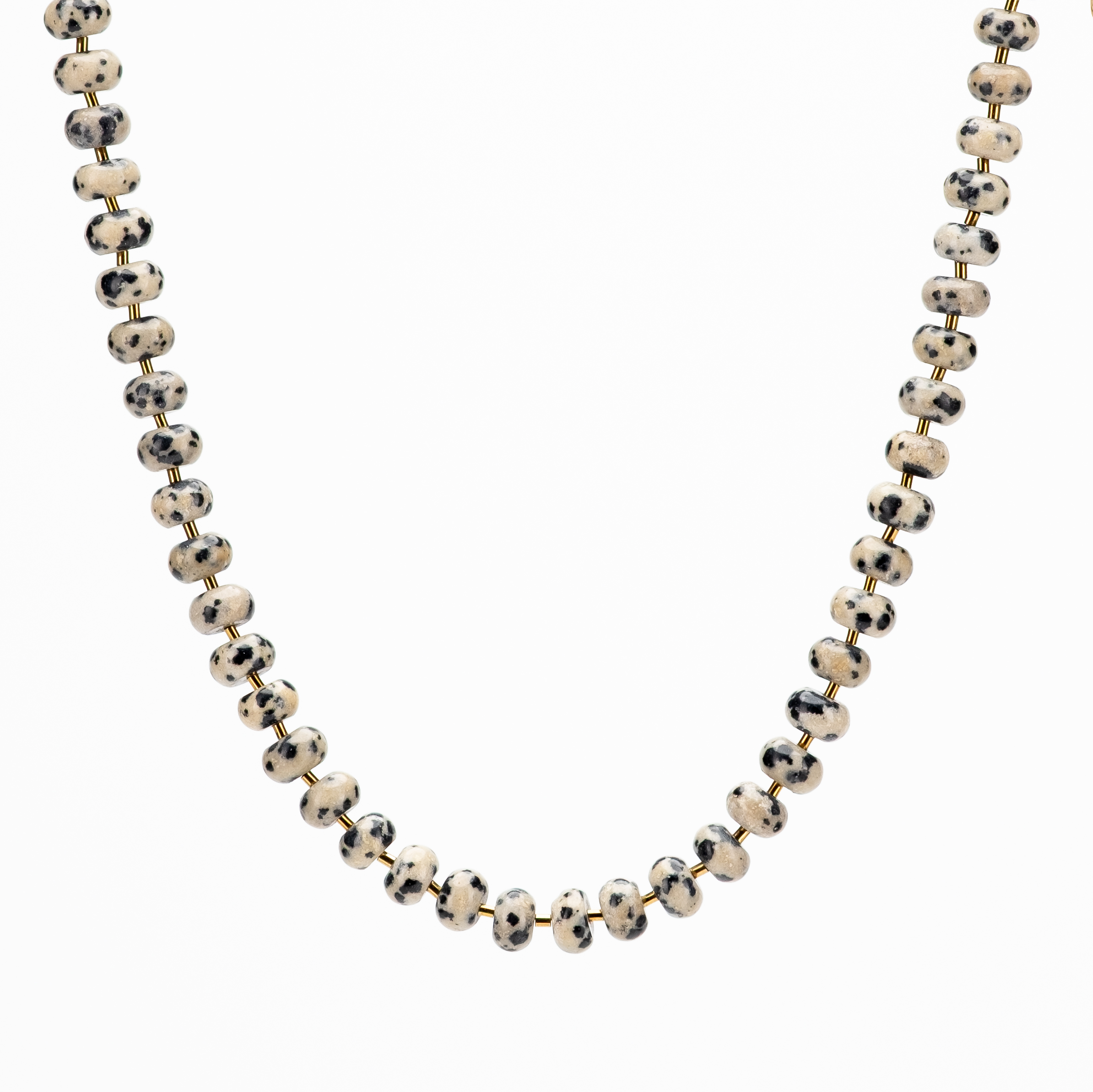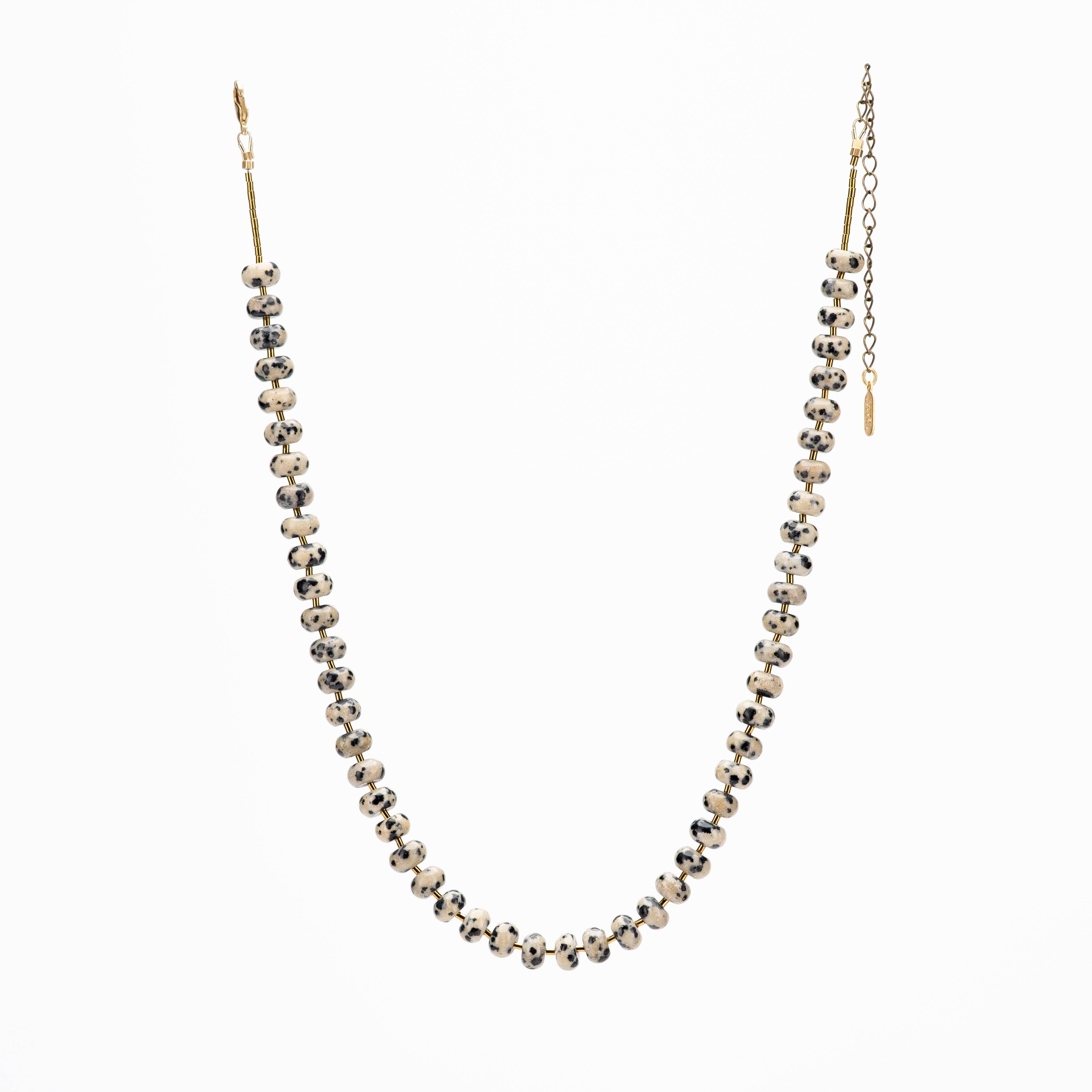Hailey Gerrits "Marlow" beaded necklace set with hand faceted dalmatian jasper and gold plated hematite spacers with brass findings.