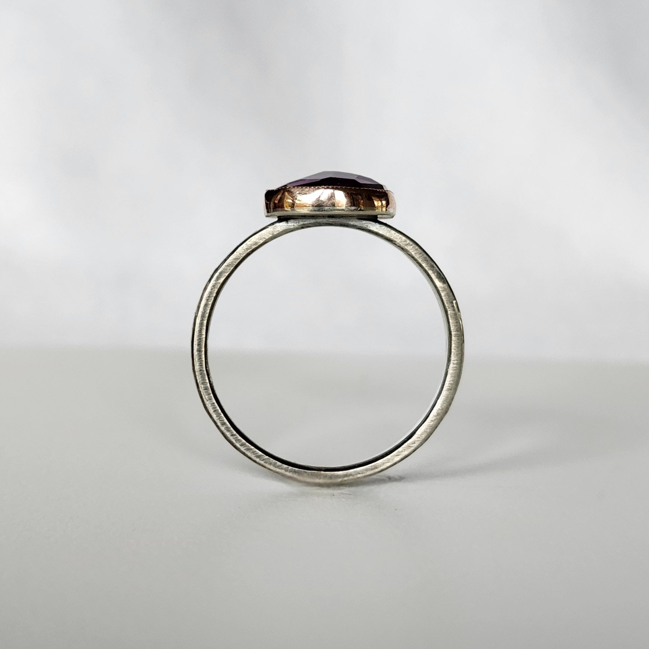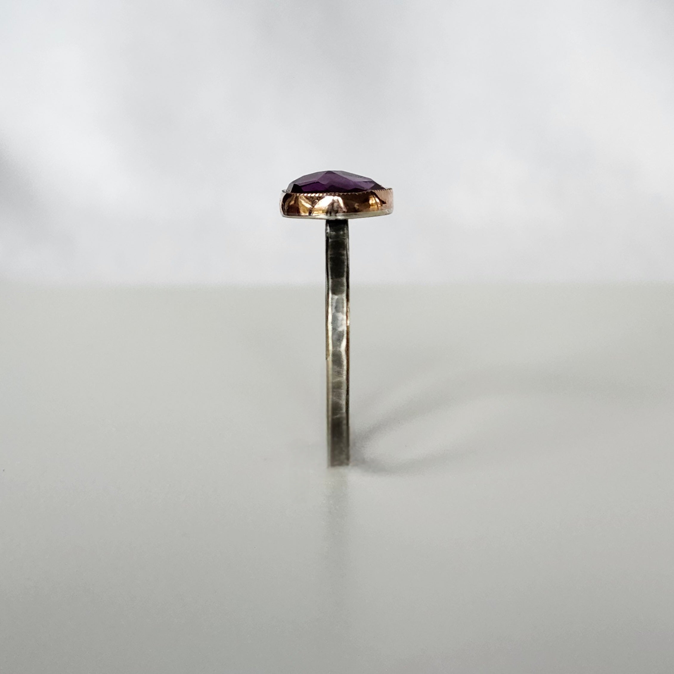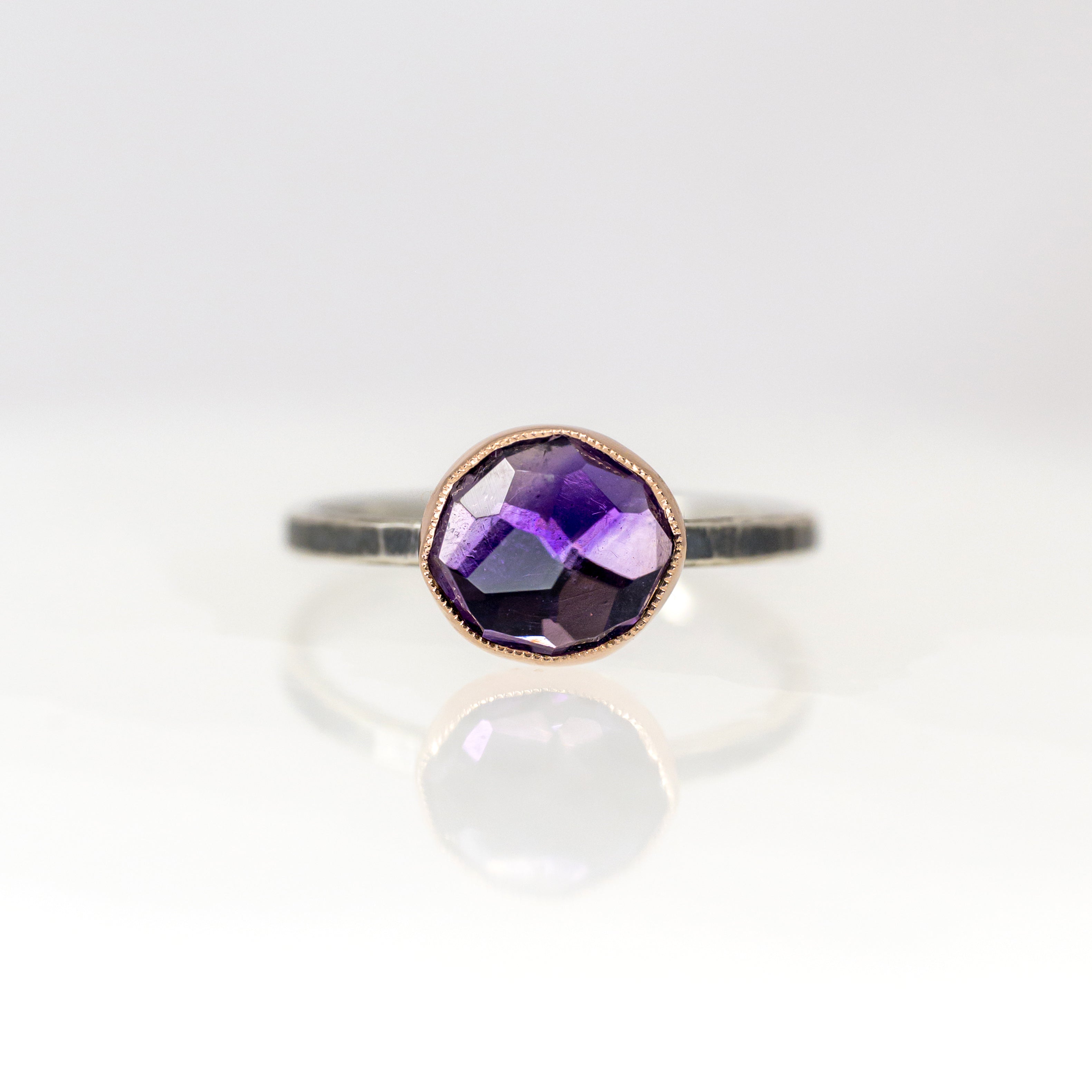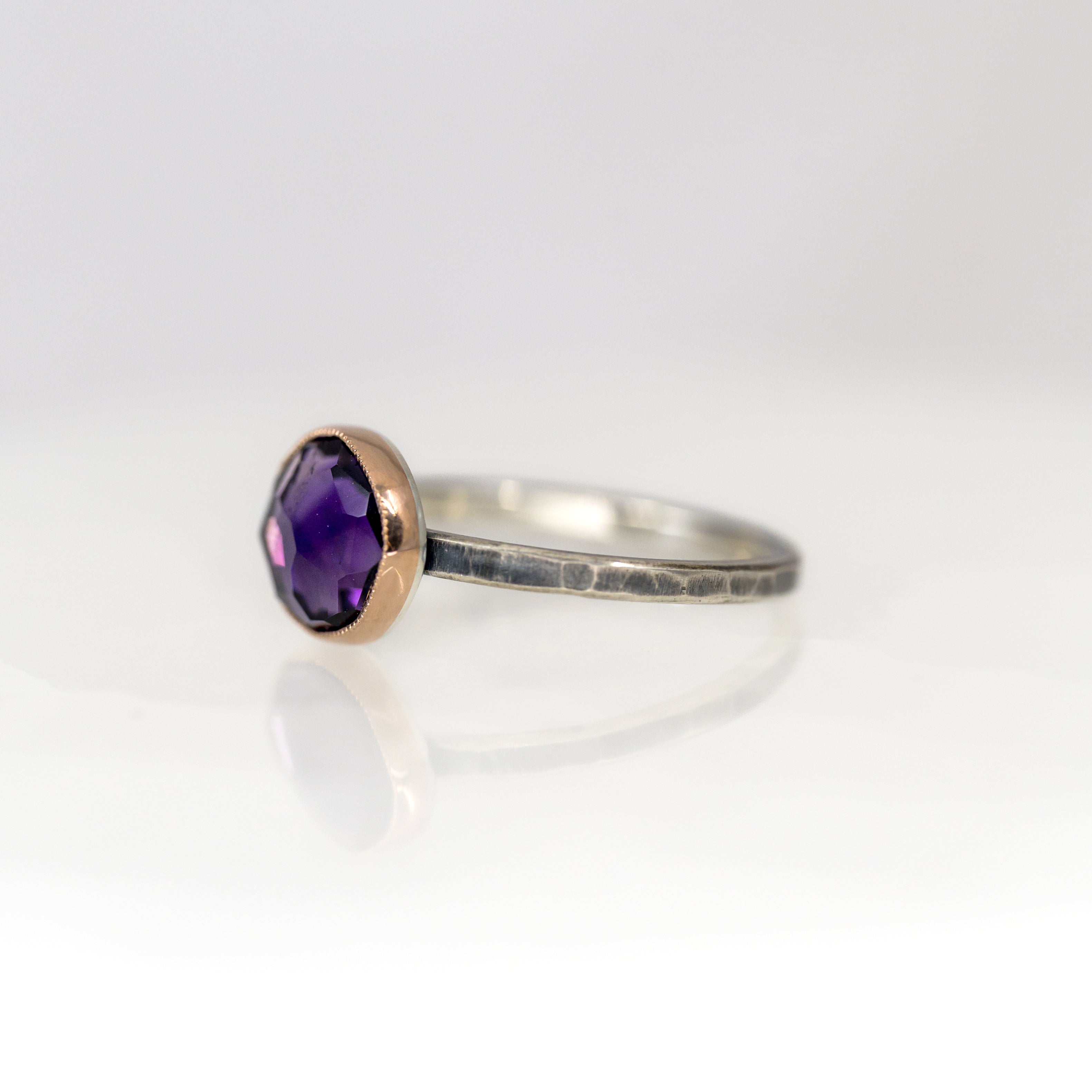 Jen Leddy ring, bezel set with one amethyst with a milgrain edge design
