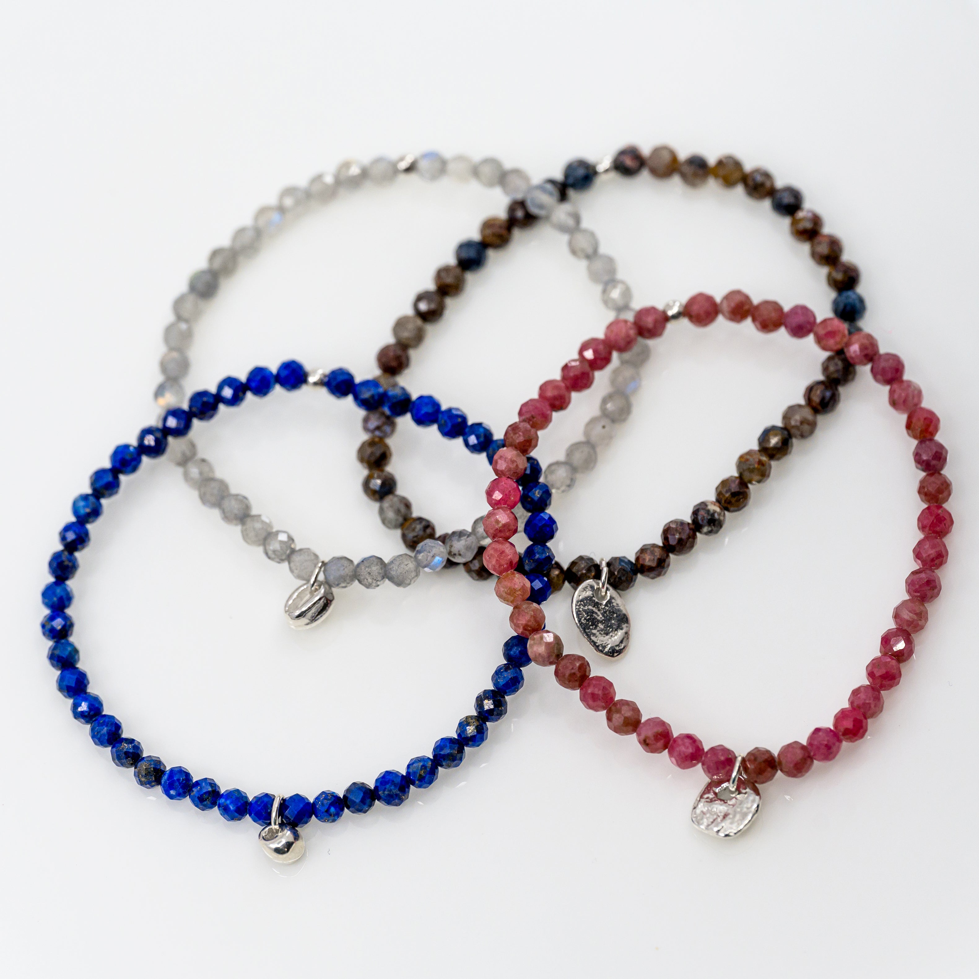 Johanna Brierley stretchy bracelet with Pietersite gemstone beads and signature lucky stones.