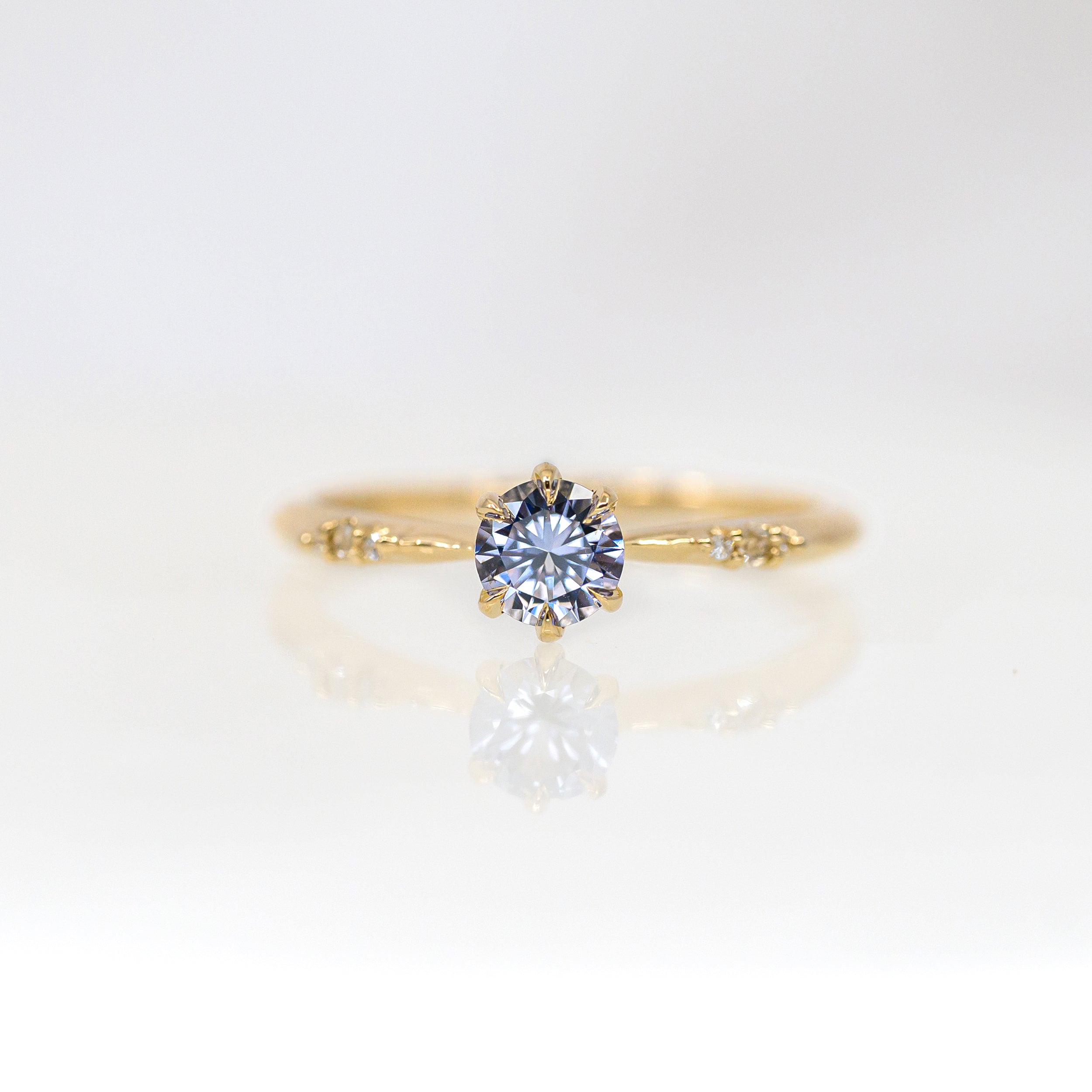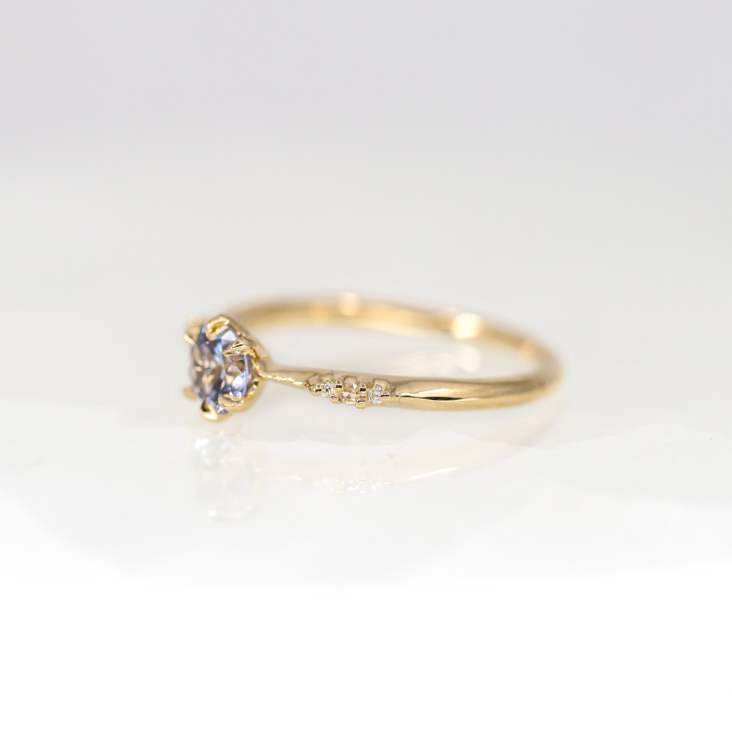 Laurie Fleming Ilona ring set with a round brilliant cut blue sapphire . An ethereal glow from a faceted moonbeam, with twinkling fairy lights floating down the band. Hand-carved with beautiful, bright 14k gold and the most petite hand-shaped claw prongs.