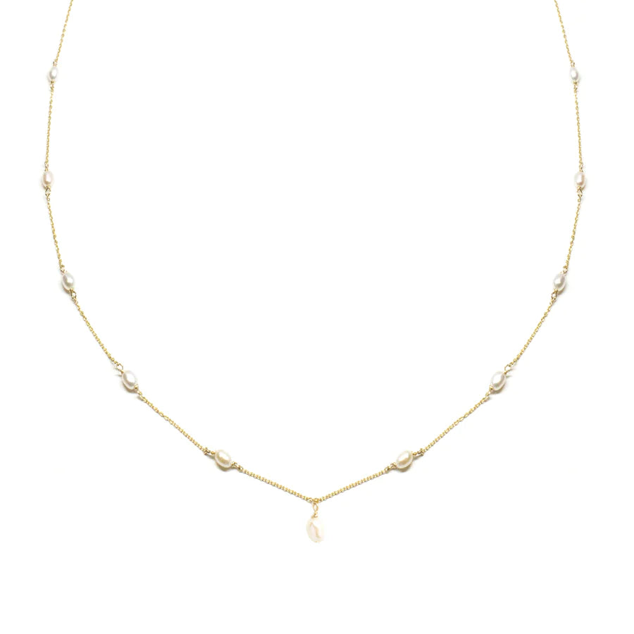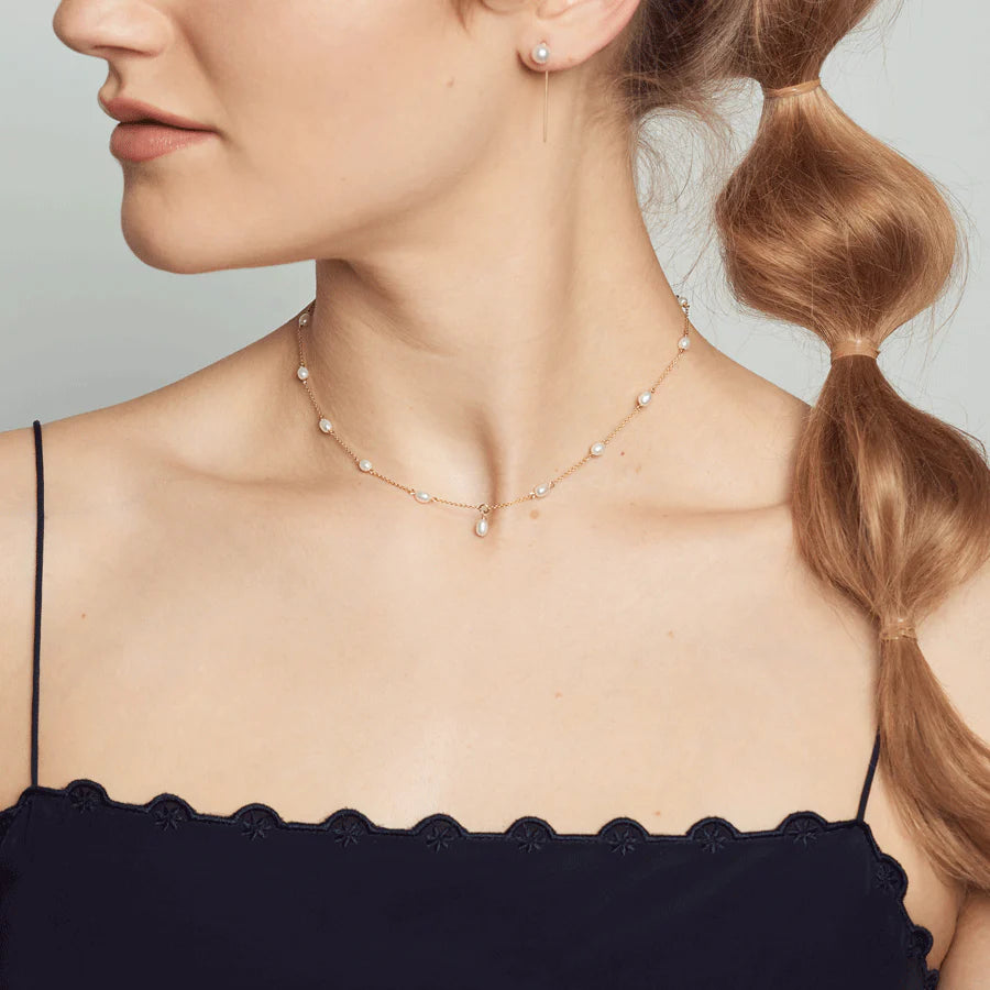 Designed by Poppy Finch, petite oval pearls evenly spaced along a dainty 14-karat gold choker necklace delicately grace the neckline with their luminous allure. Simply sweet on its own or perfect for necklace layering.