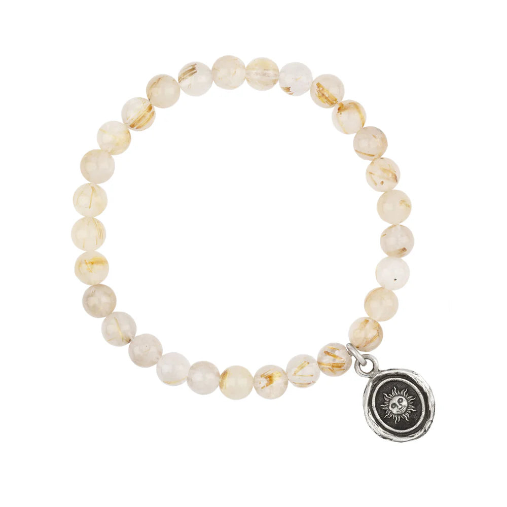 Pyrrha Joyful Appreciation bronze talisman rutilated quartz stone stretch bracelet.