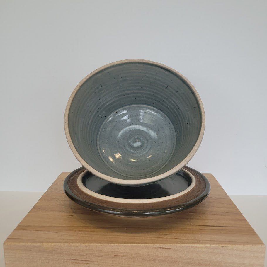 Handcrafted by Tarra Wedman Pottery, this butter dish features a domed lid with a knob handle, set on a matching plate. Finished in a soft greyish-blue glaze, the surface is decorated with raised botanical motifs that bring natural beauty to the table. It keeps butter fresh while adding an artistic touch to everyday dining.