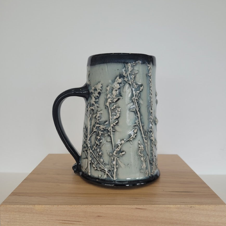 This narrow stoneware mug, made by Tarra Wedman Pottery, features a dark-toned rim and is imprinted with delicate meadow textures such as grasses, leaves, and blooms that rise gently from the surface, inviting touch. The handcrafted form highlights subtle variations in texture and glaze, giving it both a functional purpose and character.