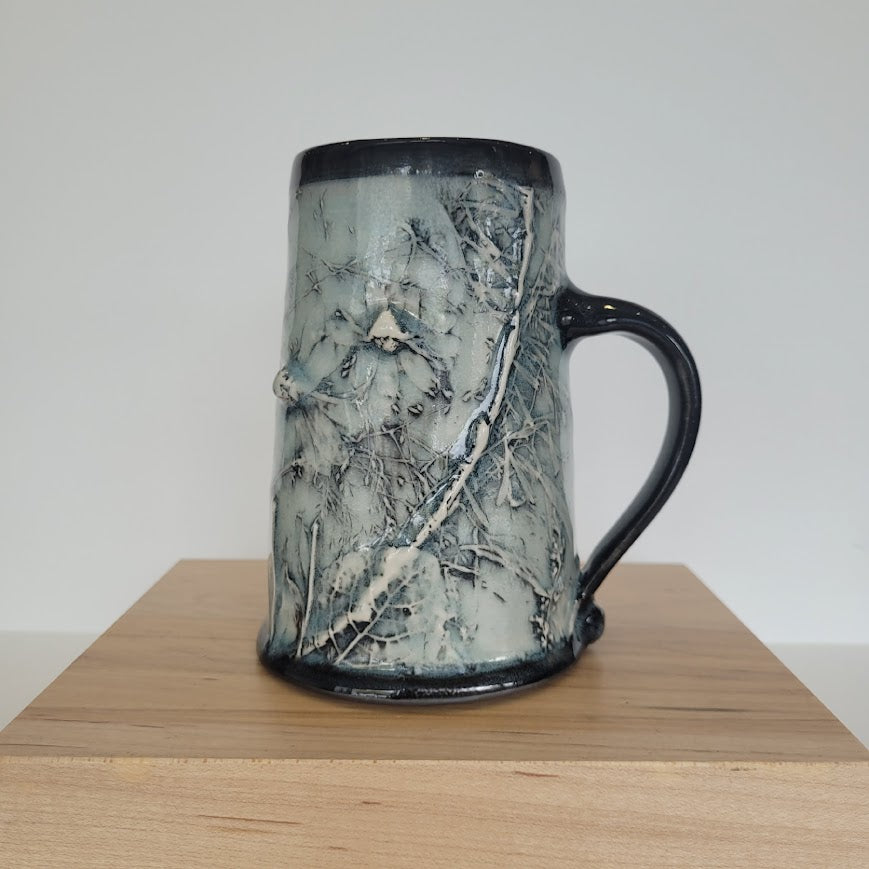This narrow stoneware mug, made by Tarra Wedman Pottery, features a dark-toned rim and is imprinted with delicate meadow textures: grasses, leaves, and blooms that rise gently from the surface, inviting touch. The handcrafted form highlights subtle variations in texture and glaze, giving it both functional purpose and character.