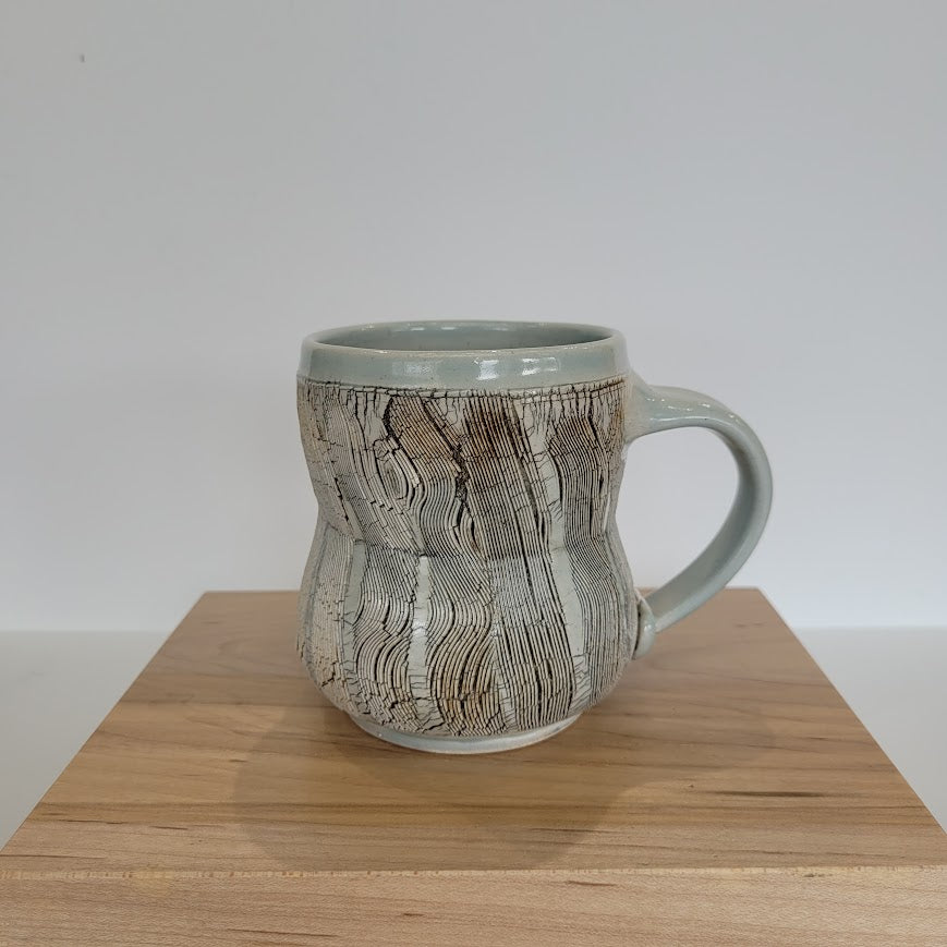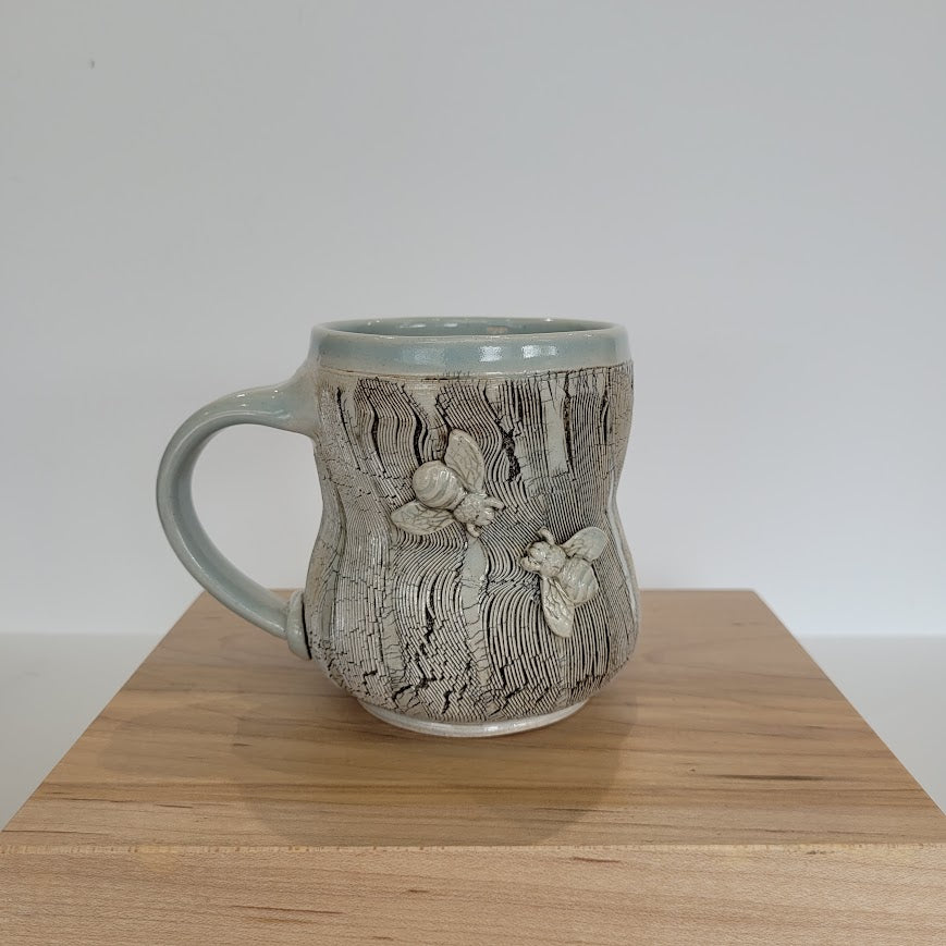 This handcrafted ceramic mug by Tarra Wedman Pottery features a soft teal-grey glaze that brings out the beauty of its tree bark-inspired texture. Finely carved woodgrain and raised bees add a whimsical, nature-inspired touch. Its gently curved shape sits comfortably in your hand, with a handle positioned for right-handed use. A lovely piece of handmade craftsmanship to savour your favorite drink.
