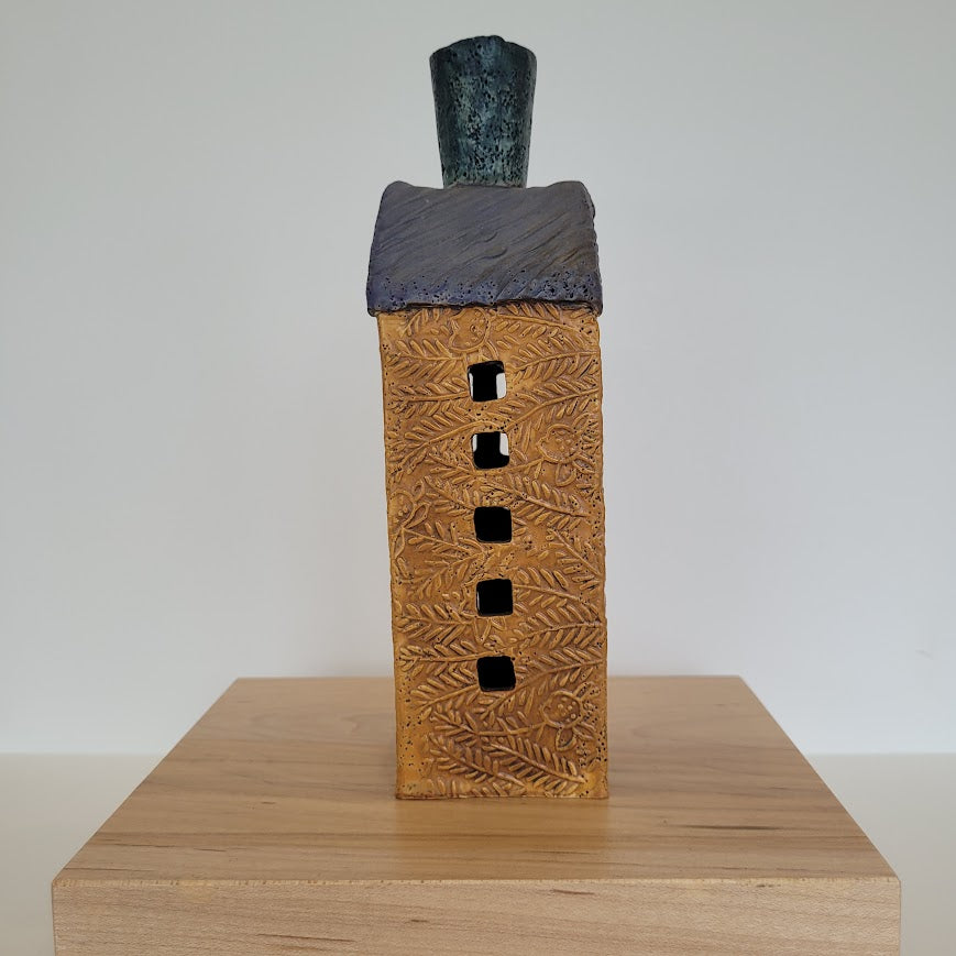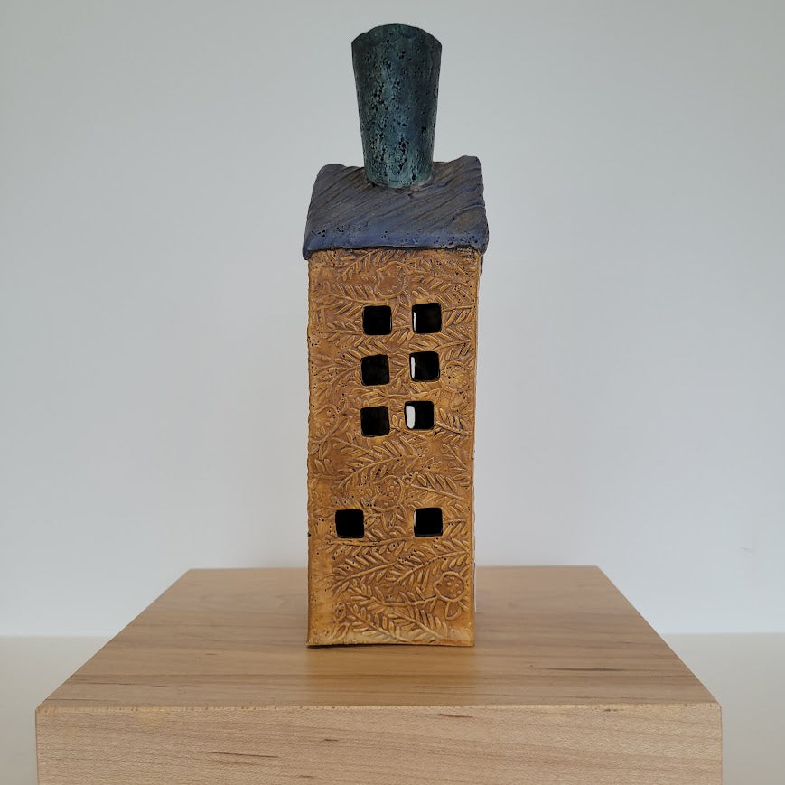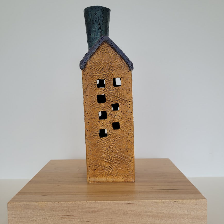 Handcrafted by Tarra Wedman Pottery, the Terracotta Brown Candle House brings cozy charm and soft light to any space. Made from ceramic with a cool blue roof and a tall chimney, it casts a gentle, inviting glow when a candle flickers inside. Perfect for adding cheerful warmth to your shelf, mantel, or tabletop décor.