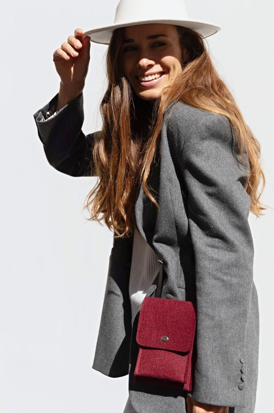 Woolberry's stylish and functional wool felt crossbody phone bag in bordeaux.