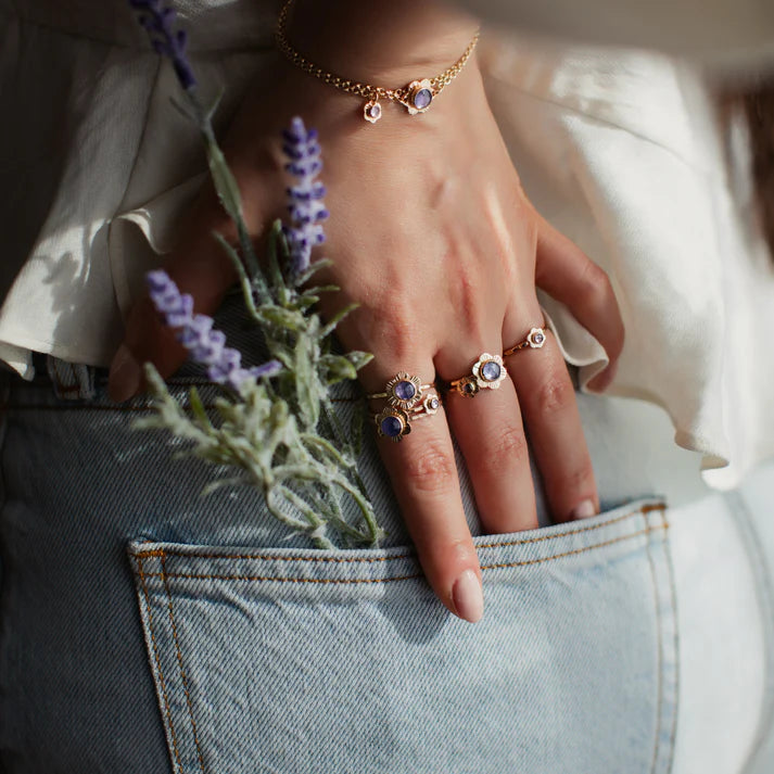 Strut Jewelry flower ring. Handcrafted with intricate floral details and a glowing rose-cut aquamarine gemstone, this flower ring embodies the beauty of a flower in full bloom, capturing your unique life force with every delicate petal.