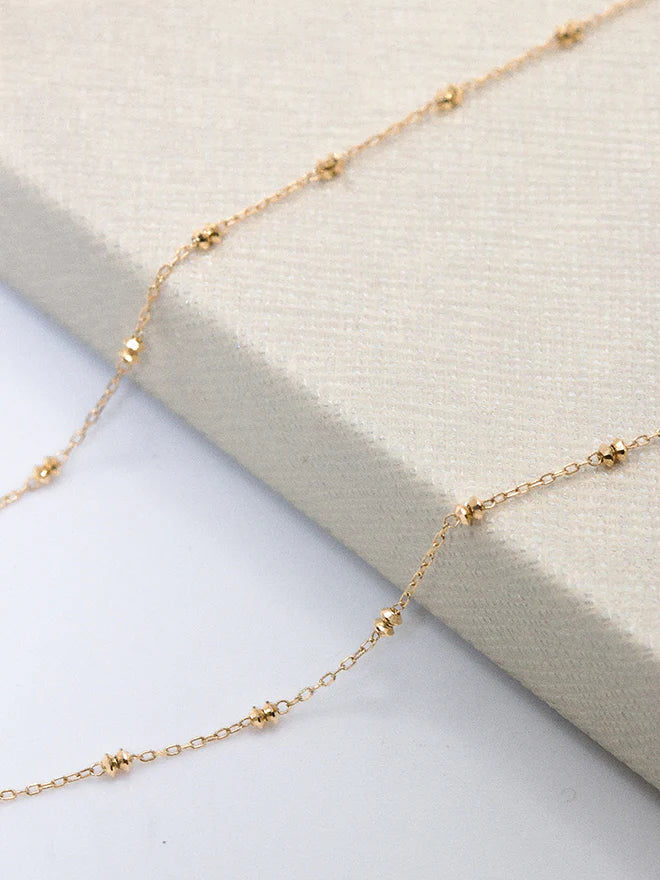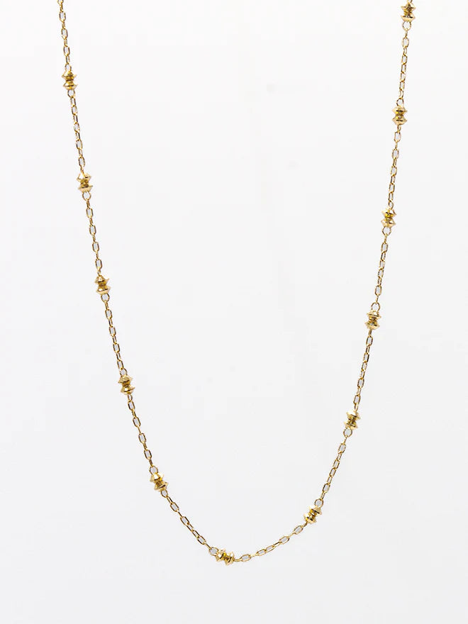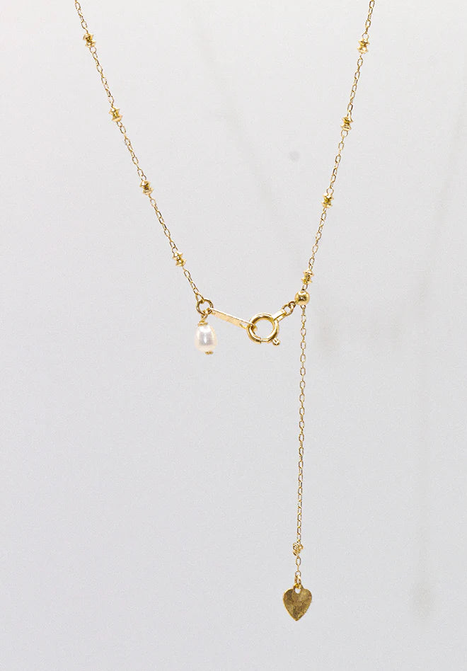 Poppy Finch duo bead station necklace, with duo bead stations alternating on a fine link chain with a delicate heart at the end and the signature pearl dangle at the clasp.