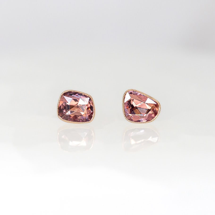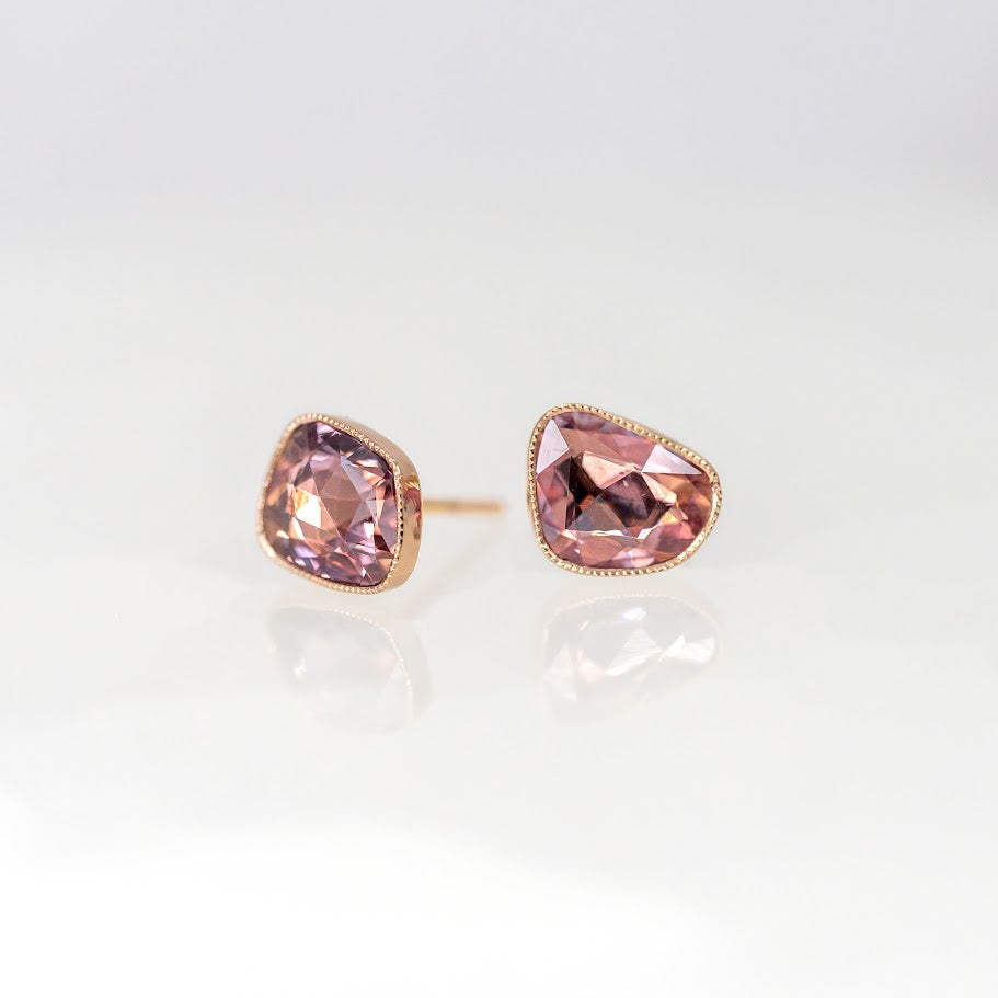 Jen Leddy stud earrings set with asymmetrical purplish pink sapphires in a milgrain bezel design.