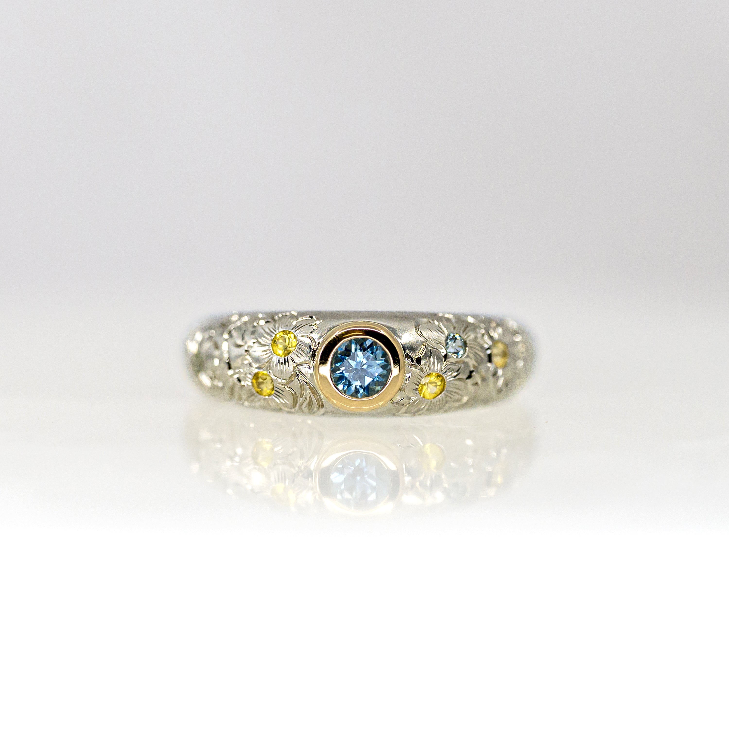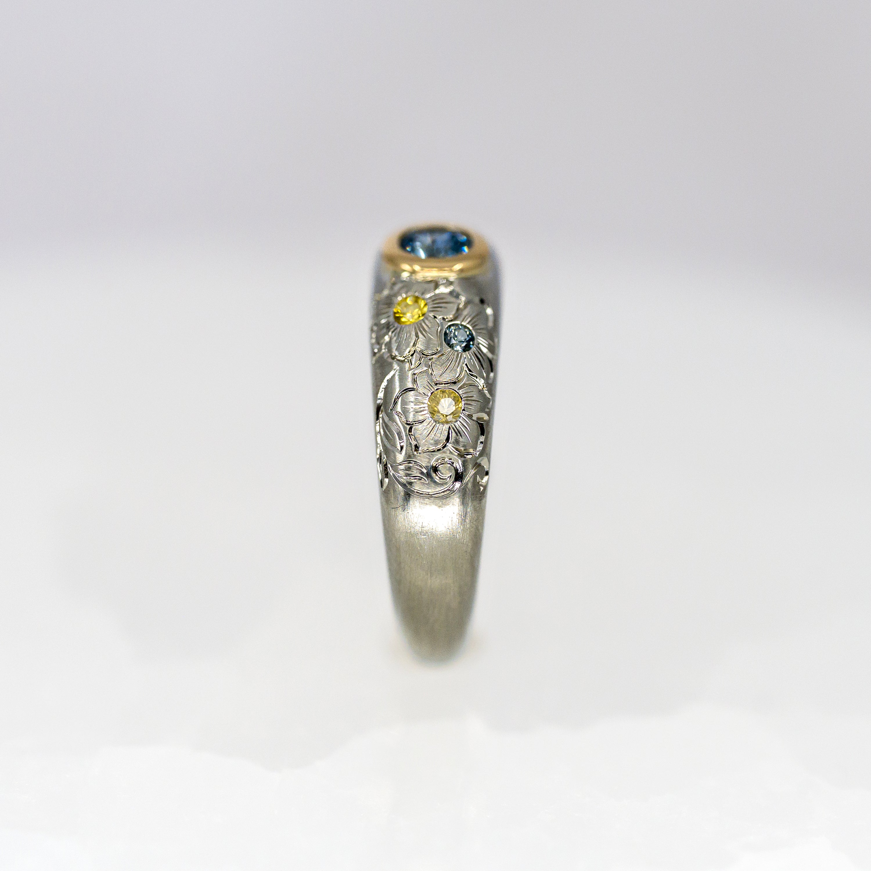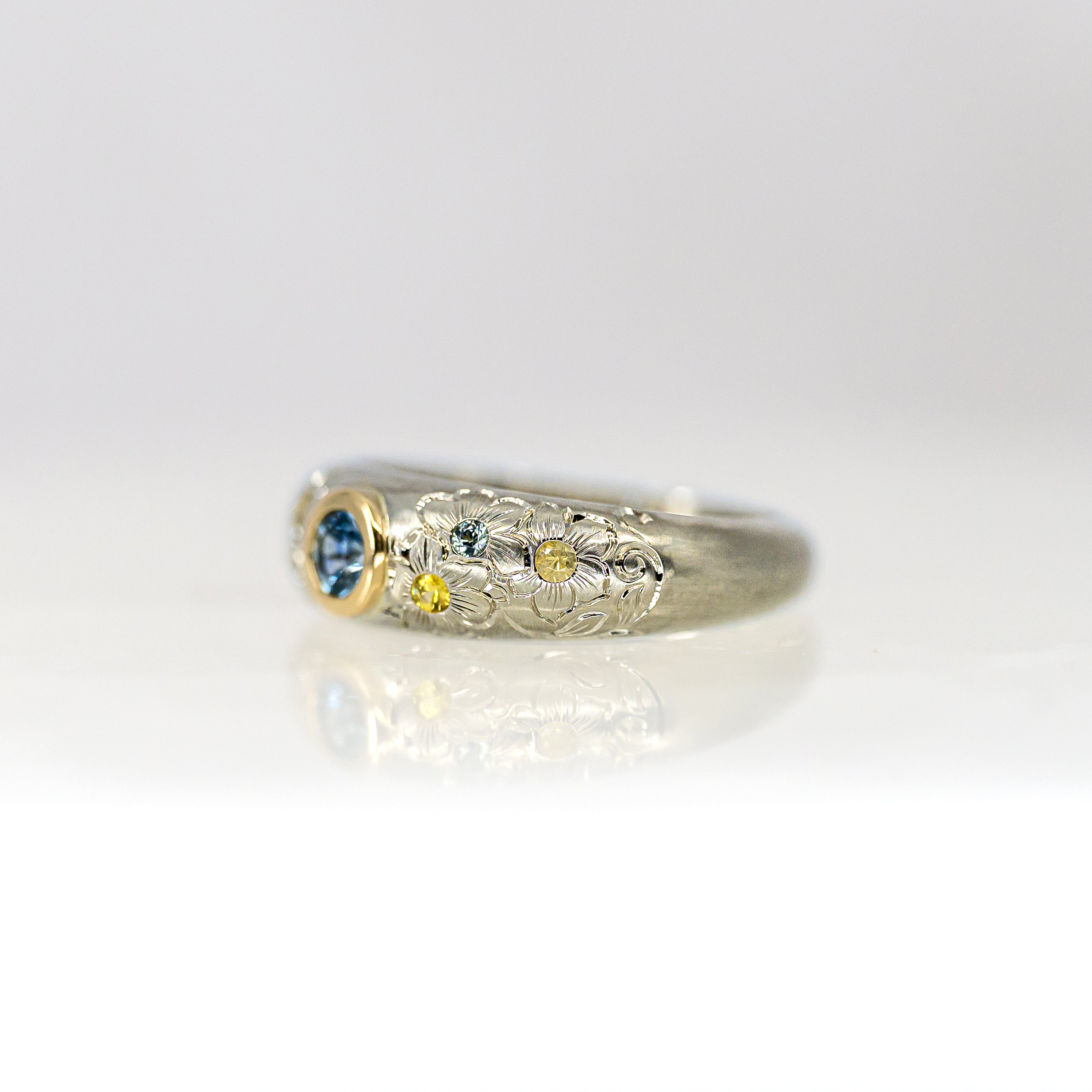 Etched in Time Concept bezel set with one teal round sapphire with yellow and green round sapphires on the shoulders, with a hand-engraved "Petal & Pathways" design