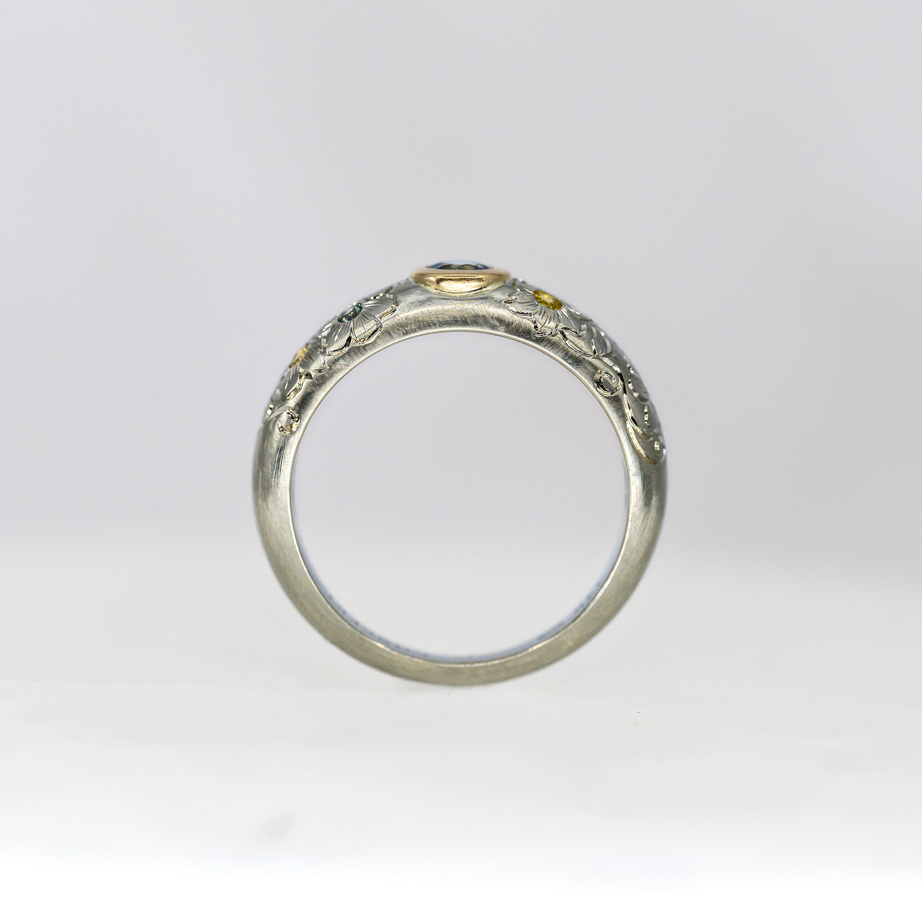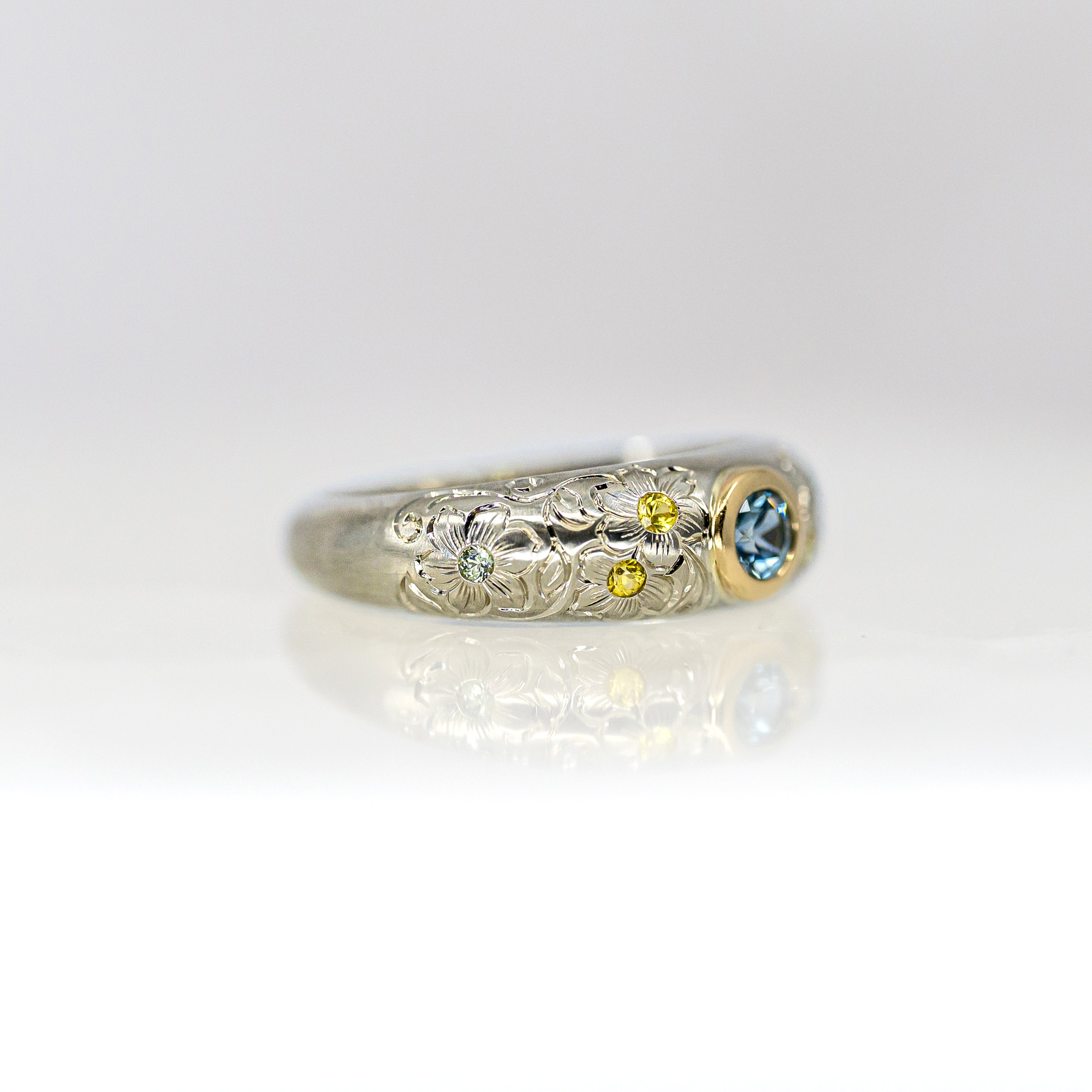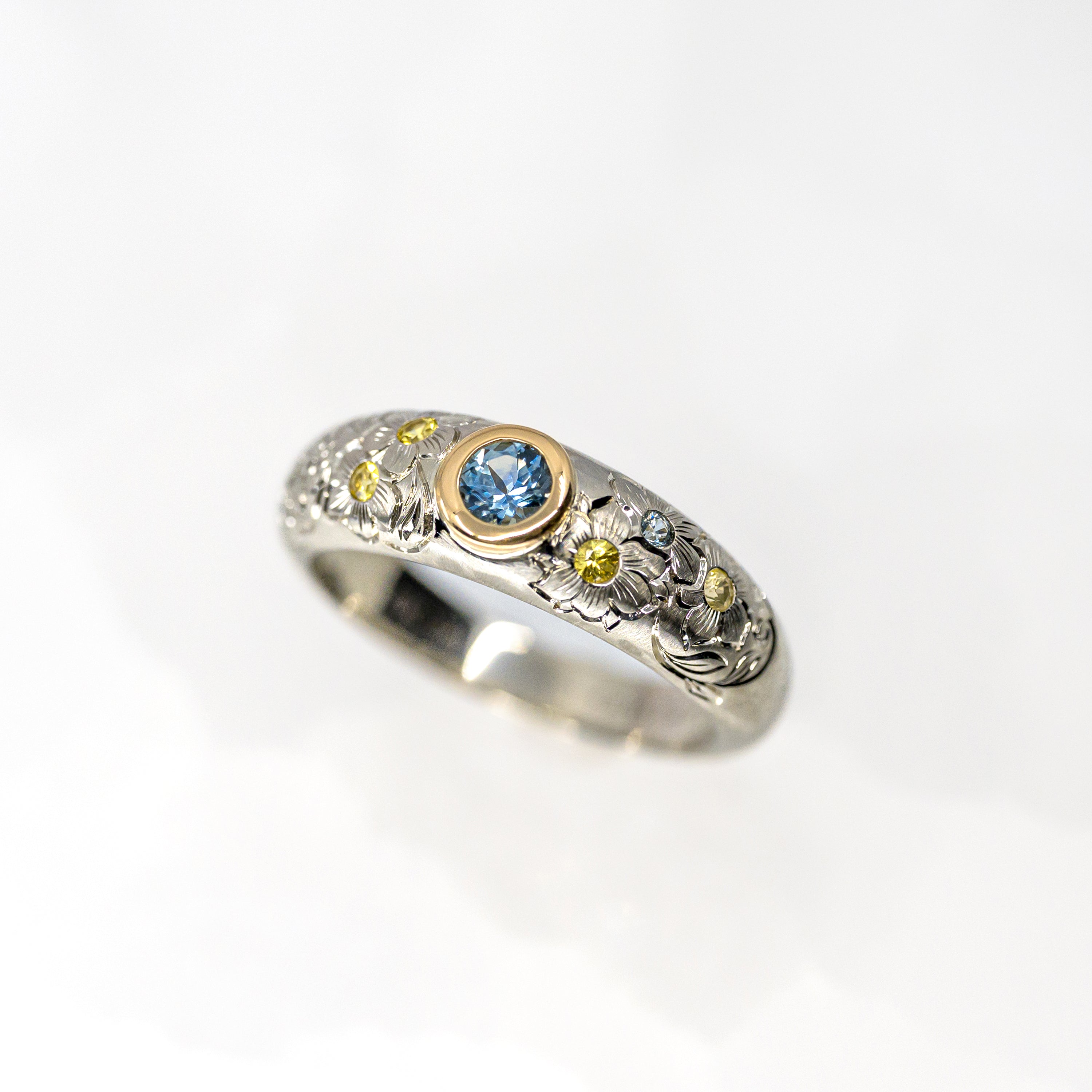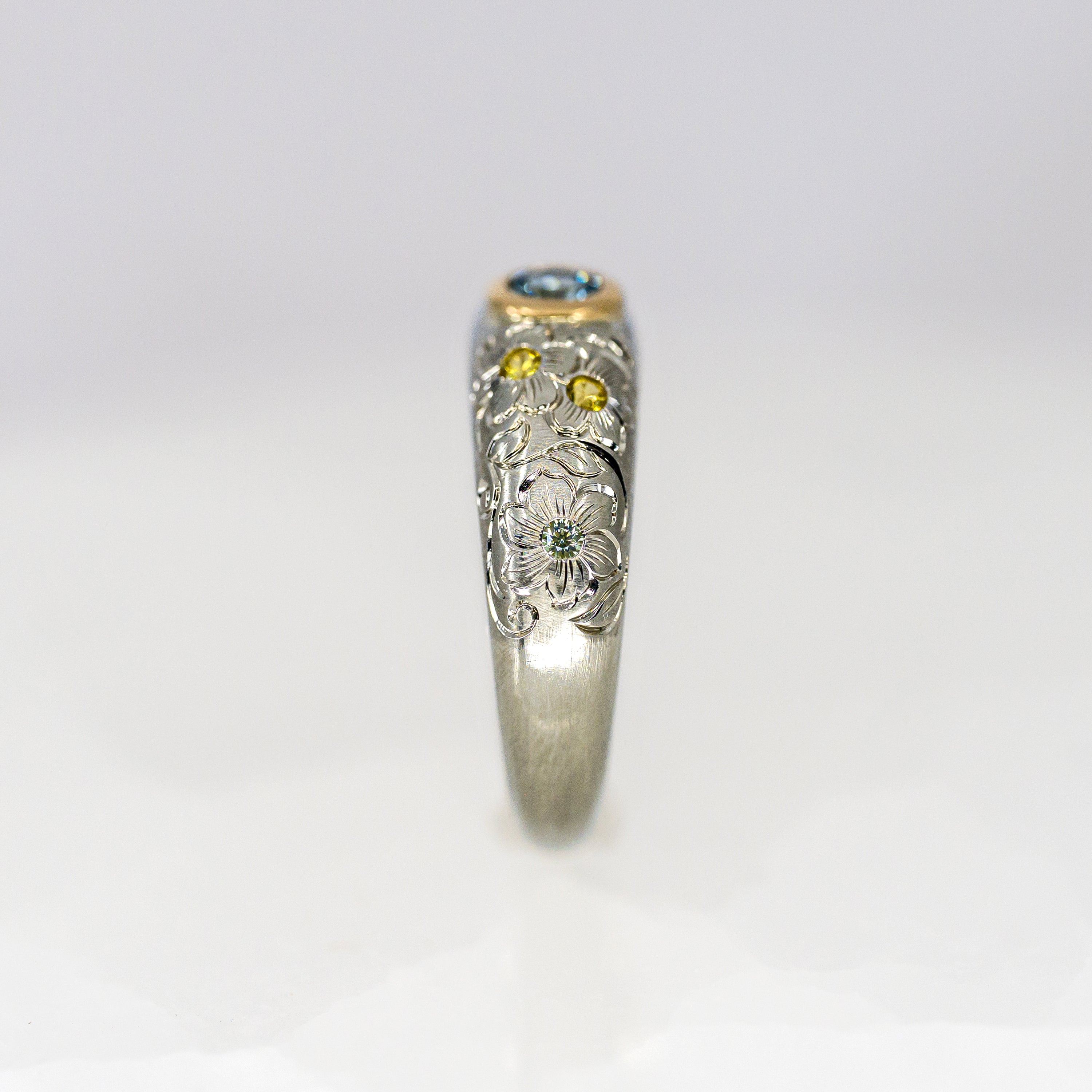 Etched in Time Concept bezel set with one teal round sapphire with yellow and green round sapphires on the shoulders, with a hand-engraved "Petal & Pathways" design