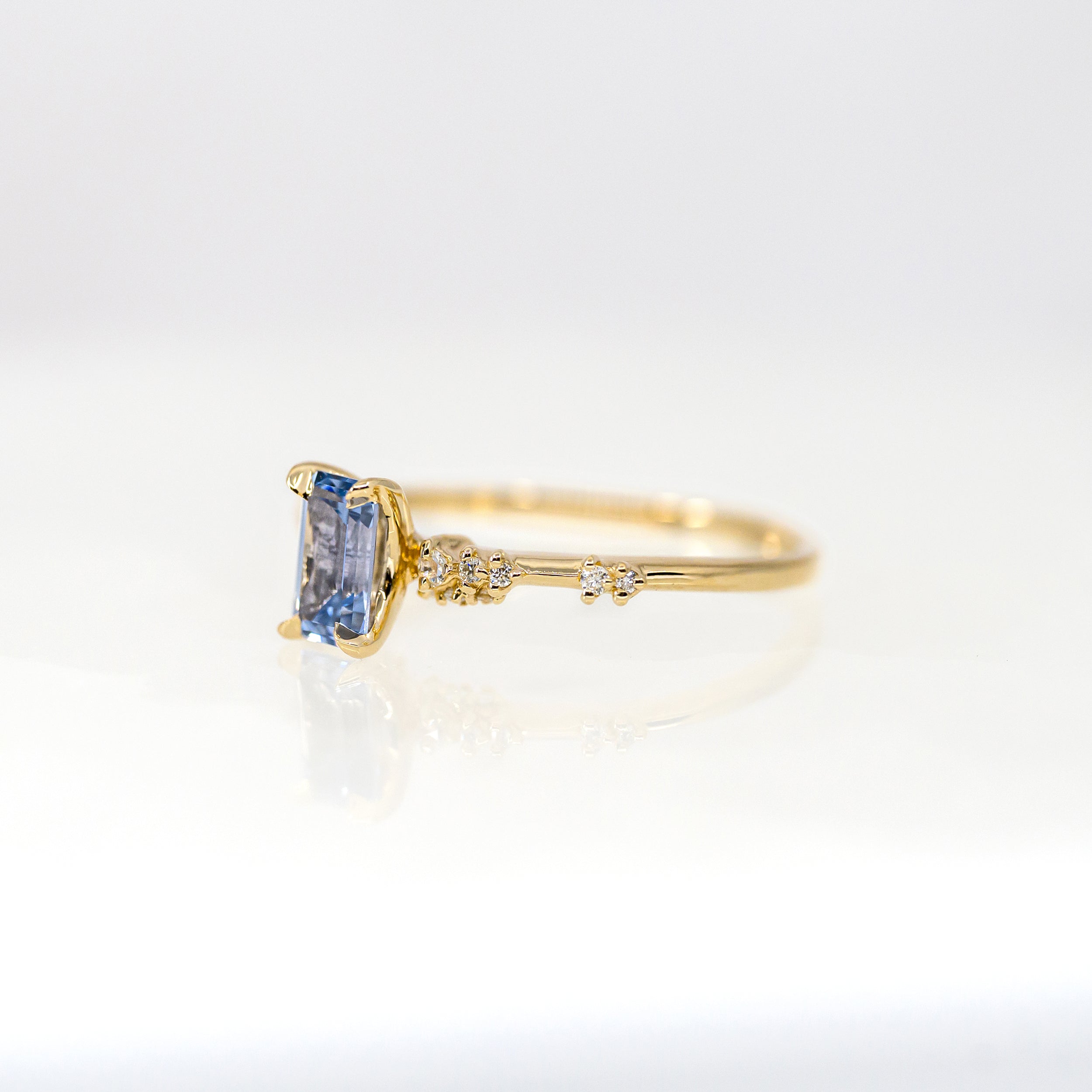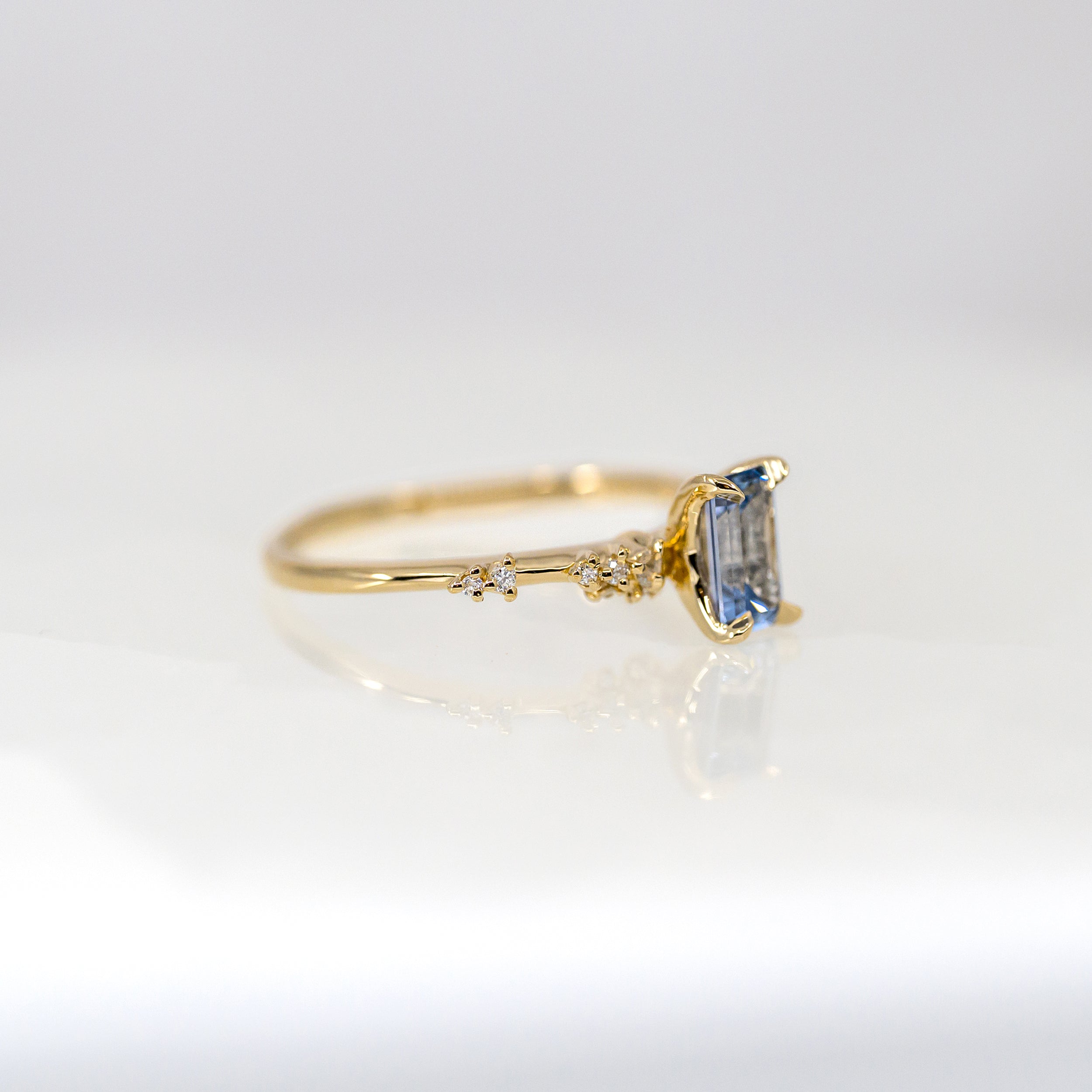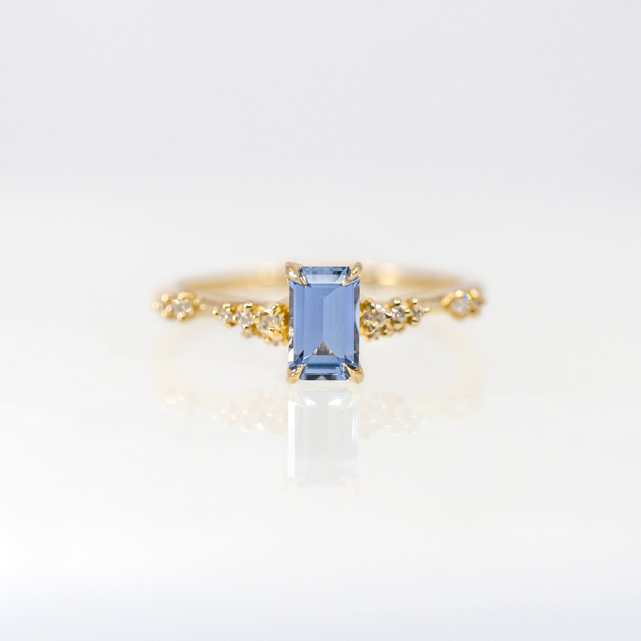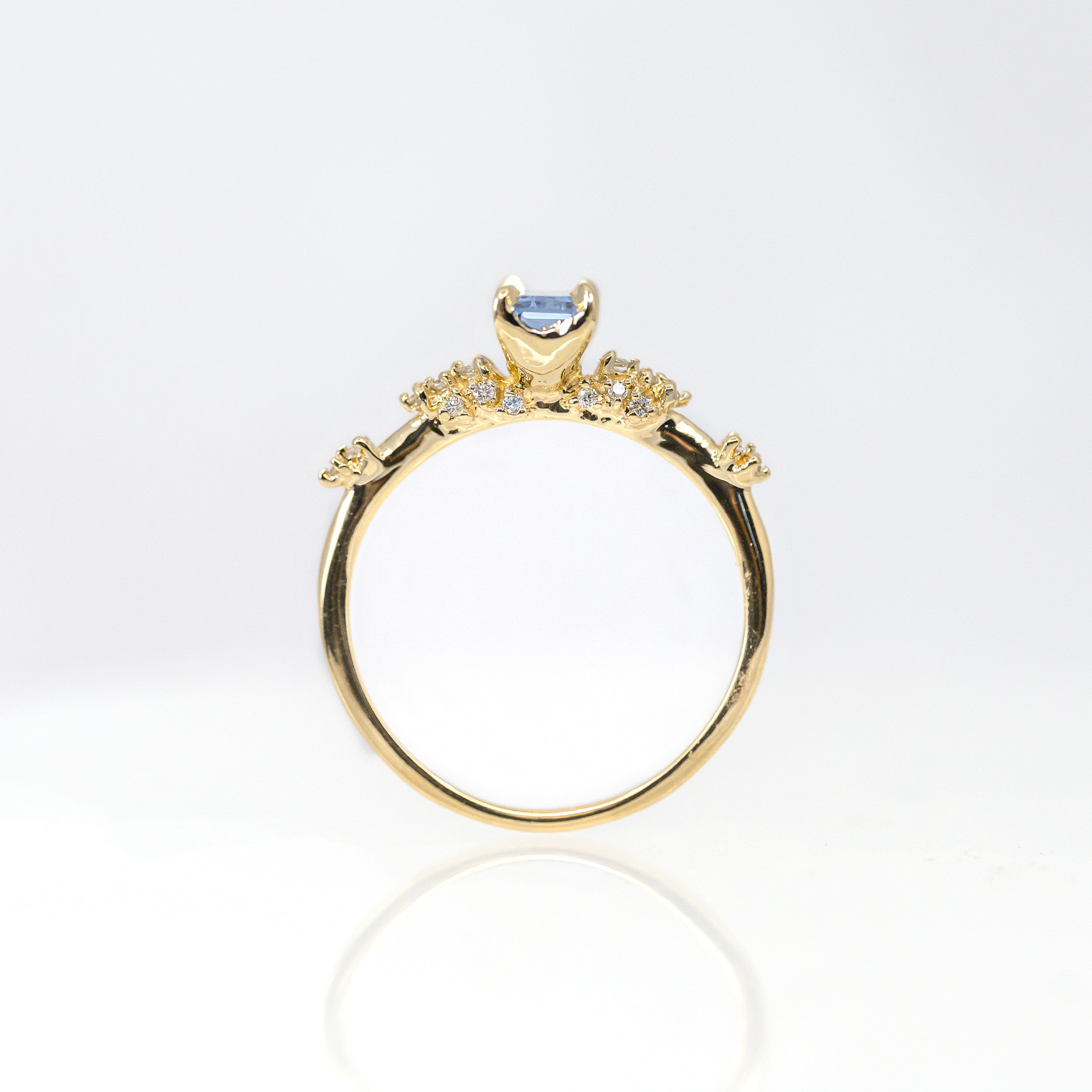 Laurie Fleming Daphne ring. Wrapping around your finger with ethereal, airy, glistening dewdrops. This Emerald Cut Sapphire Daphne features a blue sapphire centre, with the finest claws and bubbling recycled diamonds.