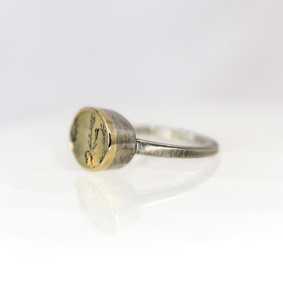 Jen Leddy ring set with one golden dendritic quartz in a smooth bezel design.