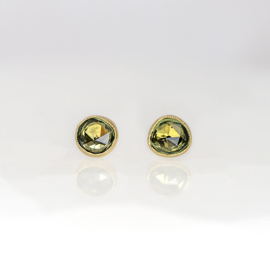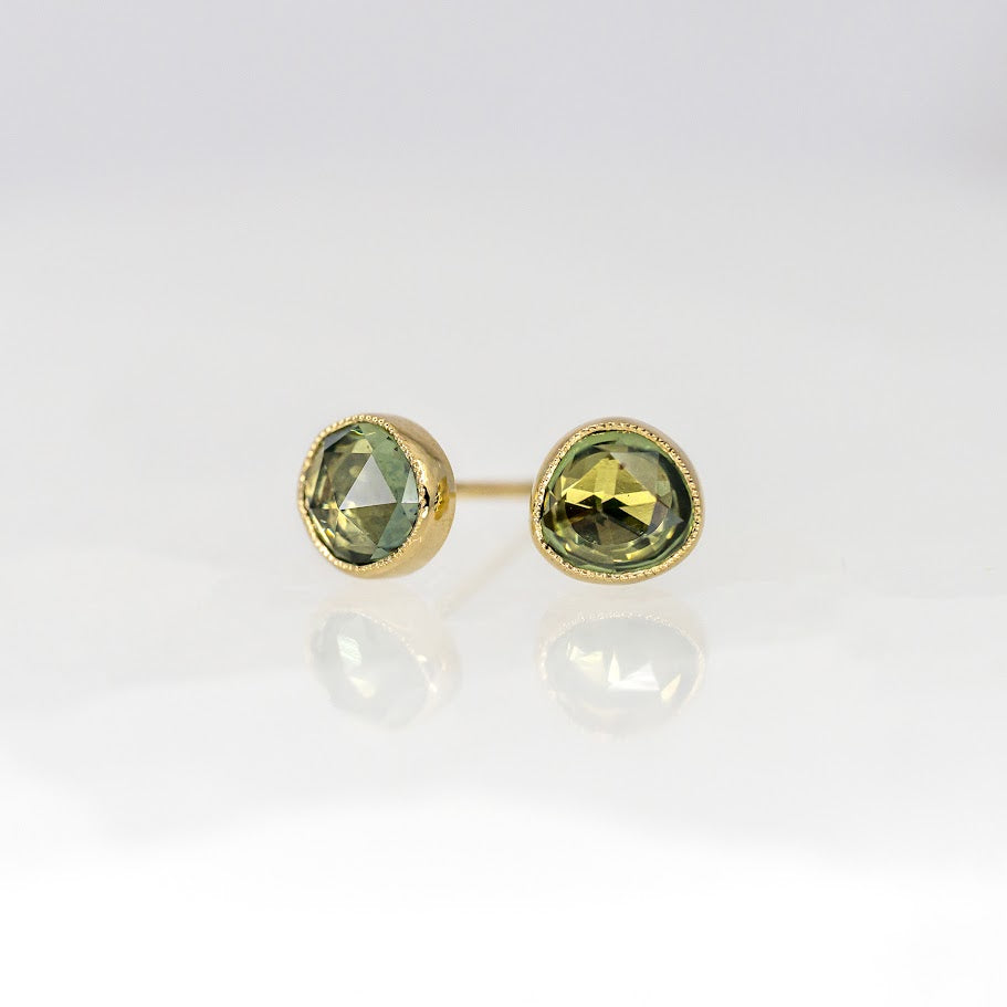 Jen Leddy stud earrings set with green sapphires in a milgrain bezel design