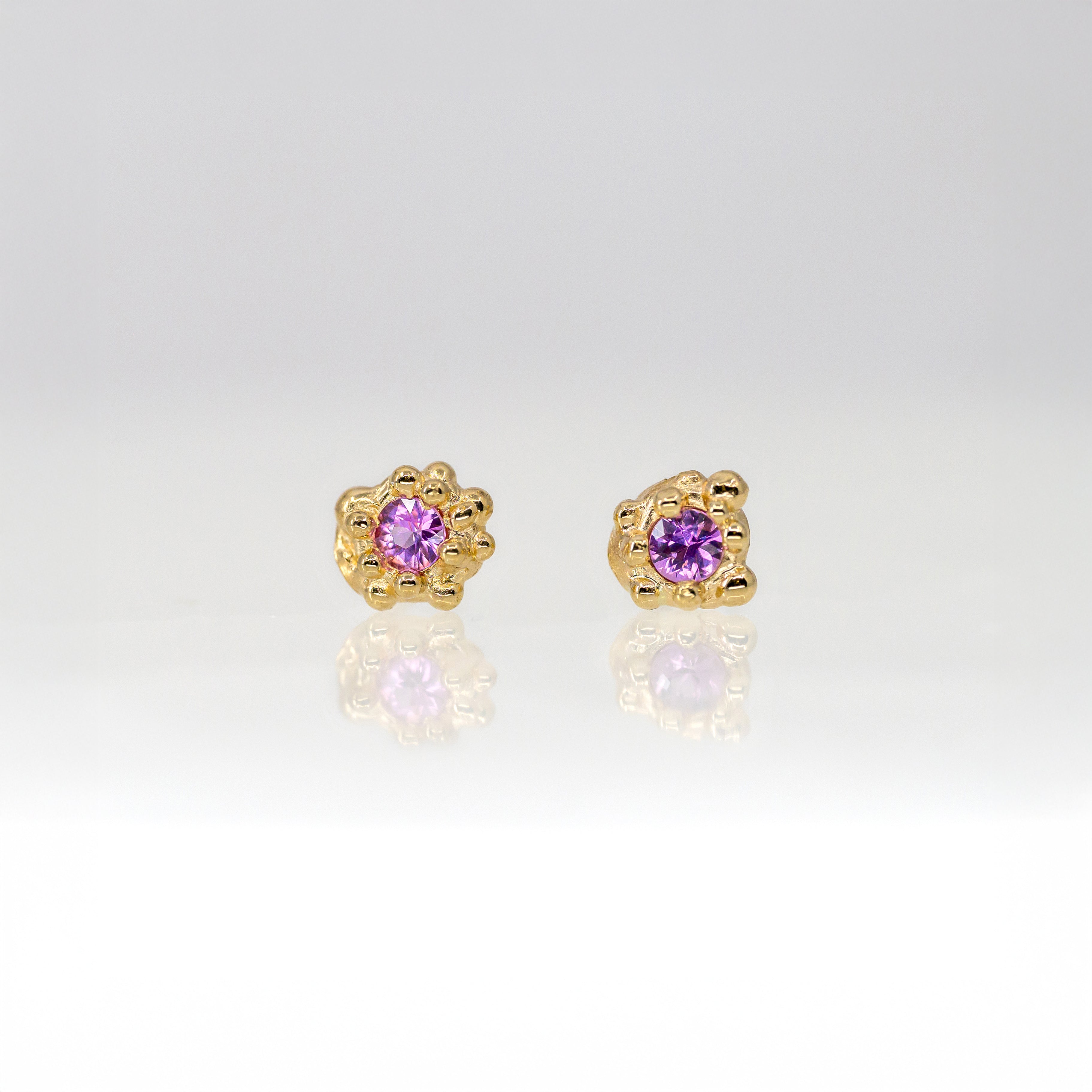 Emma Glover Mermaid Treasure stud earrings, set with brilliant cut pink round sapphires, with hand-carved texture.