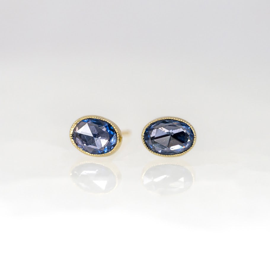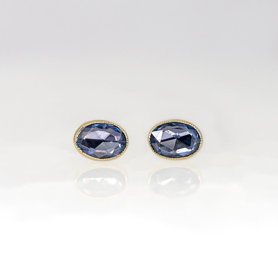 Jen Leddy stud earrings bezel set with oval rose cut blue sapphires in a milgrain bezel design