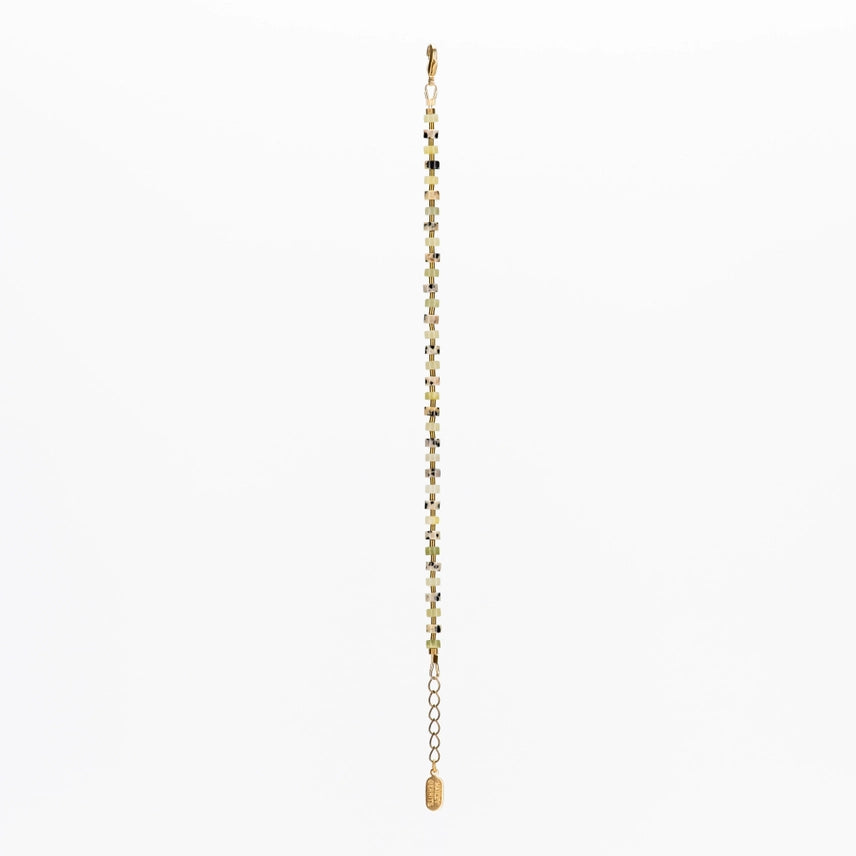 Hailey Gerrits' "Remy" beaded bracelet set with alternating dalmatian & peridot jasper, gold-plated hematite beads, and reclaimed brass accents.