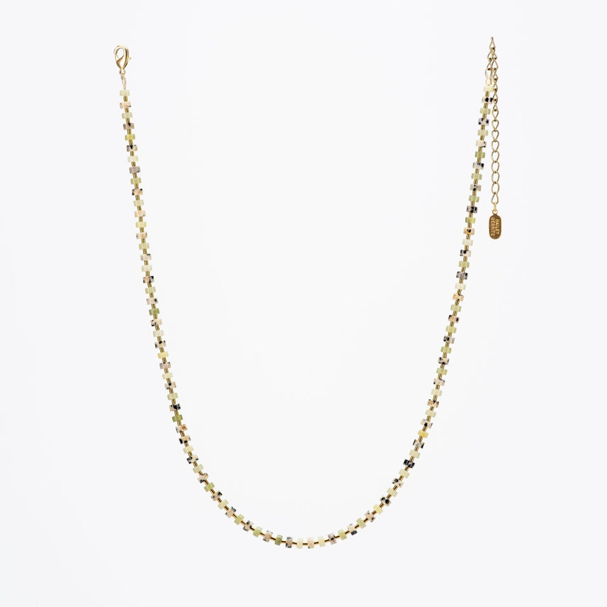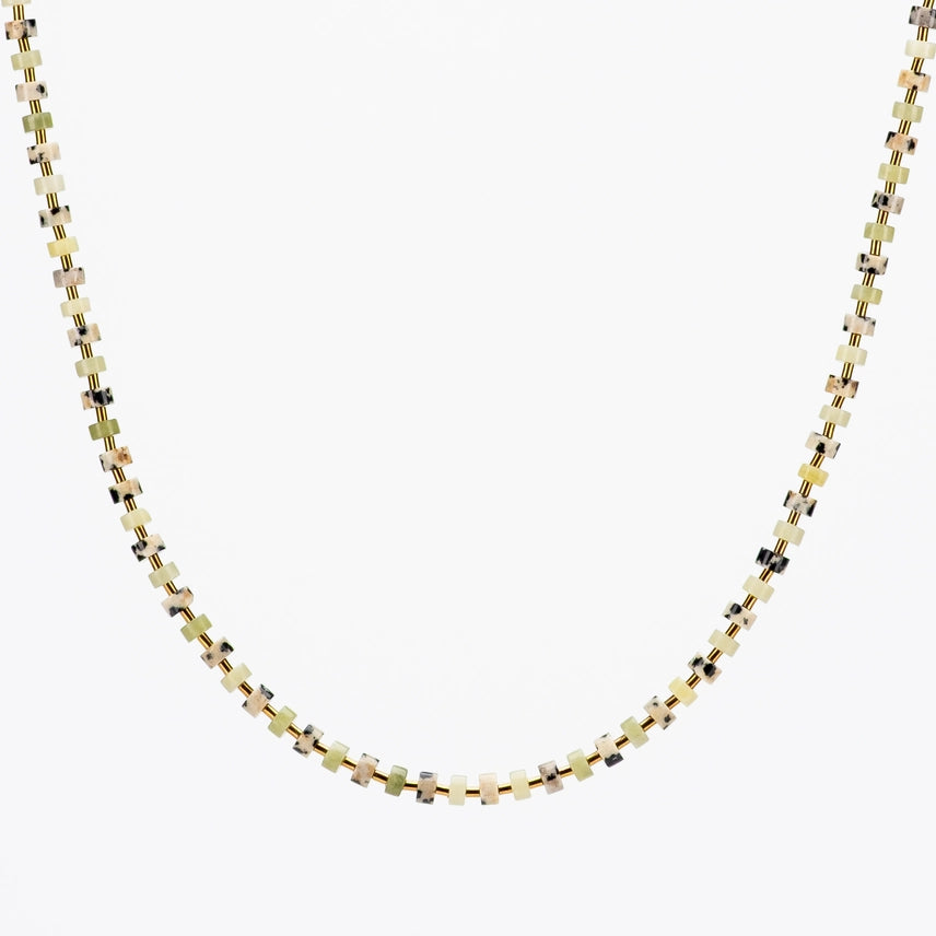 Hailey Gerrits "Remy" beaded necklace set with alternating dalmatian & peridot jasper, gold-plated hematite beads, and reclaimed brass accents.