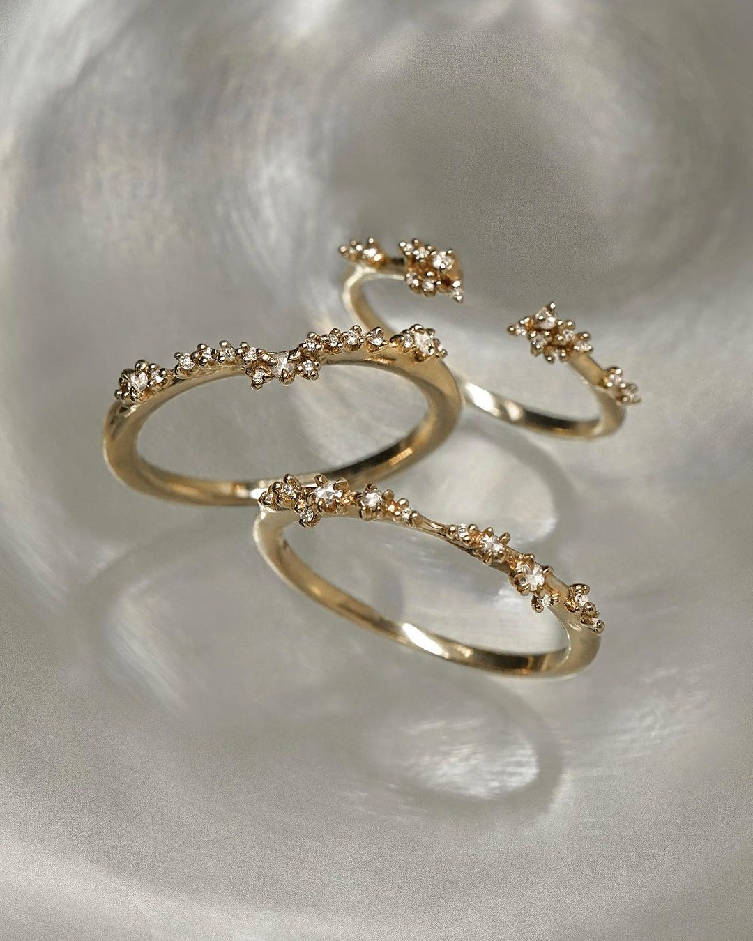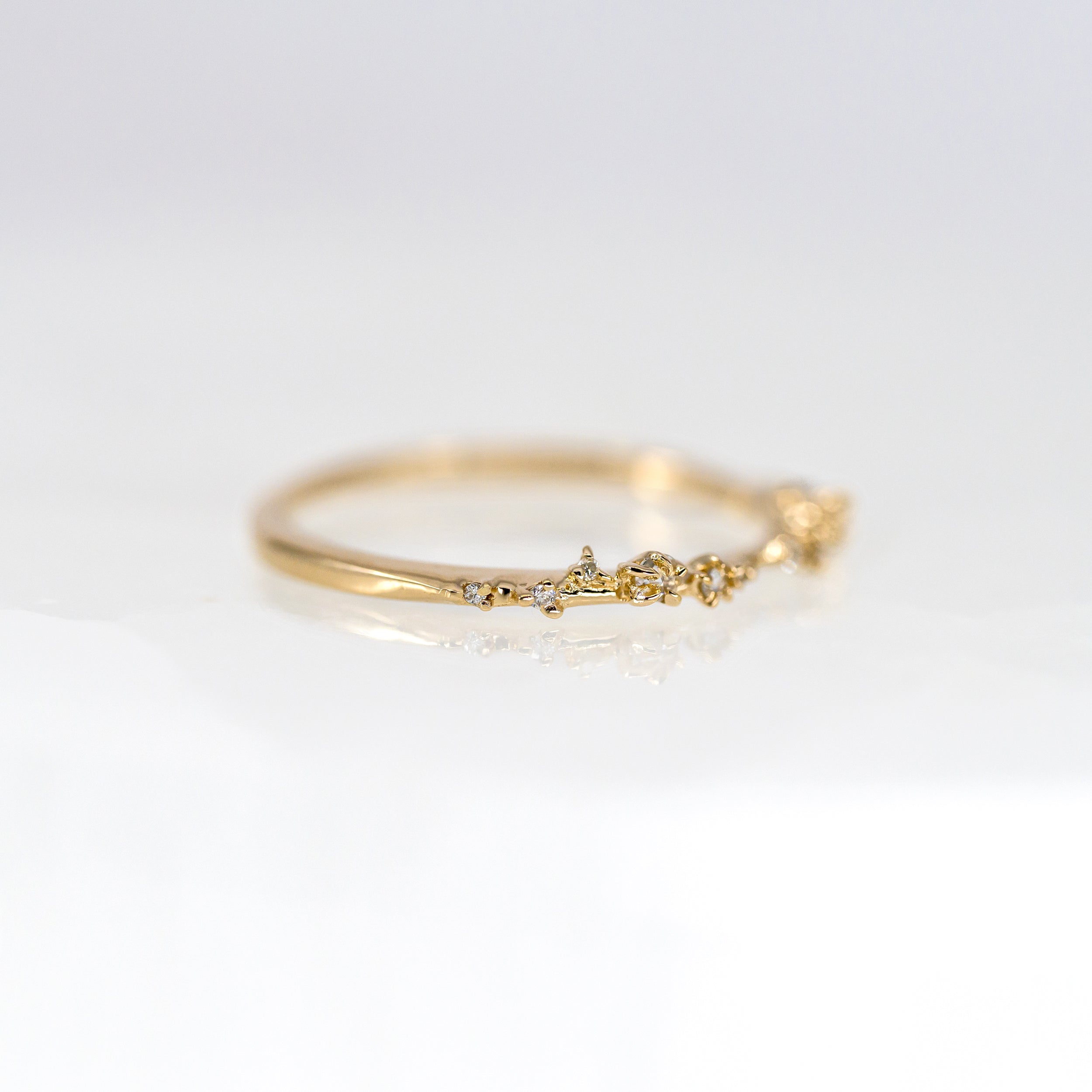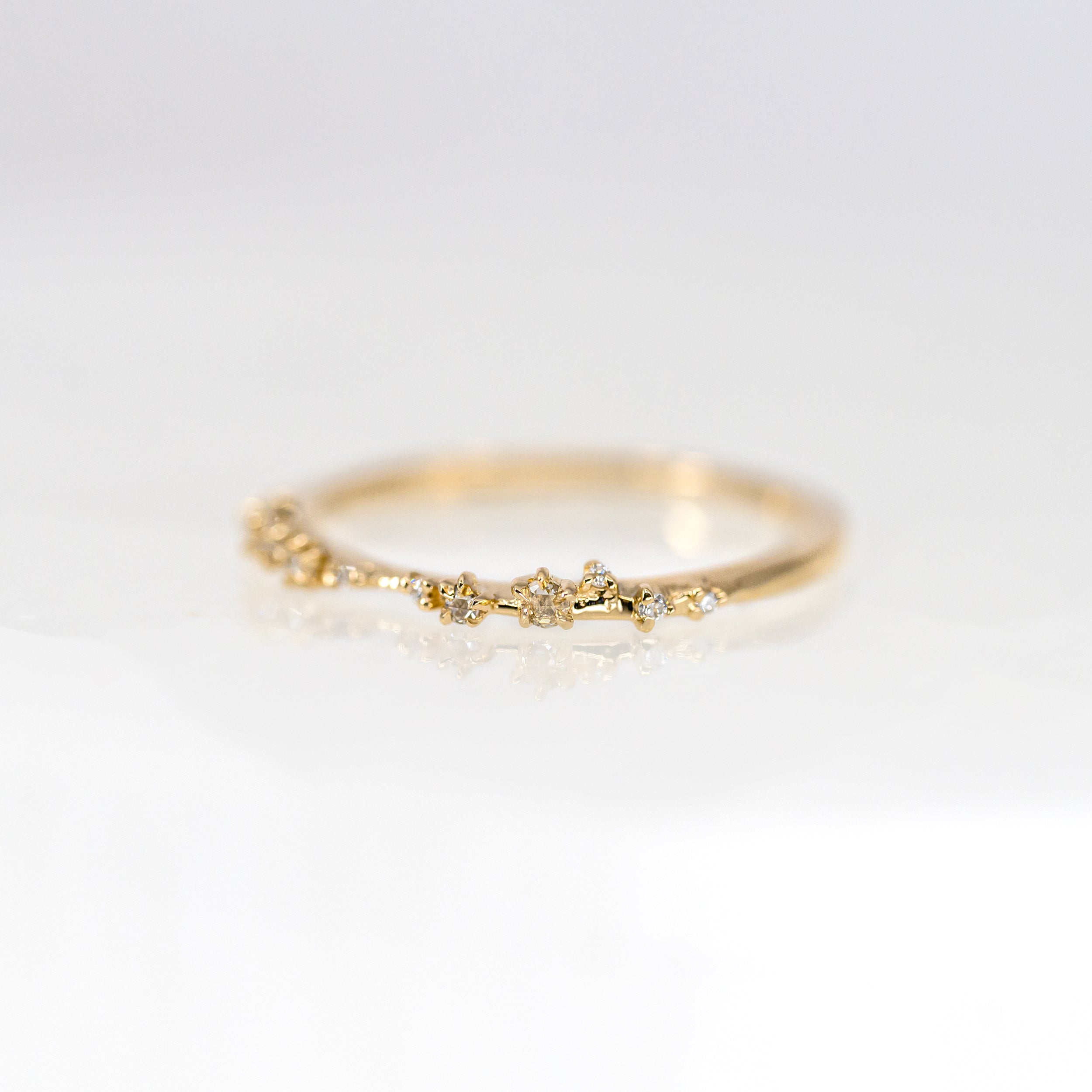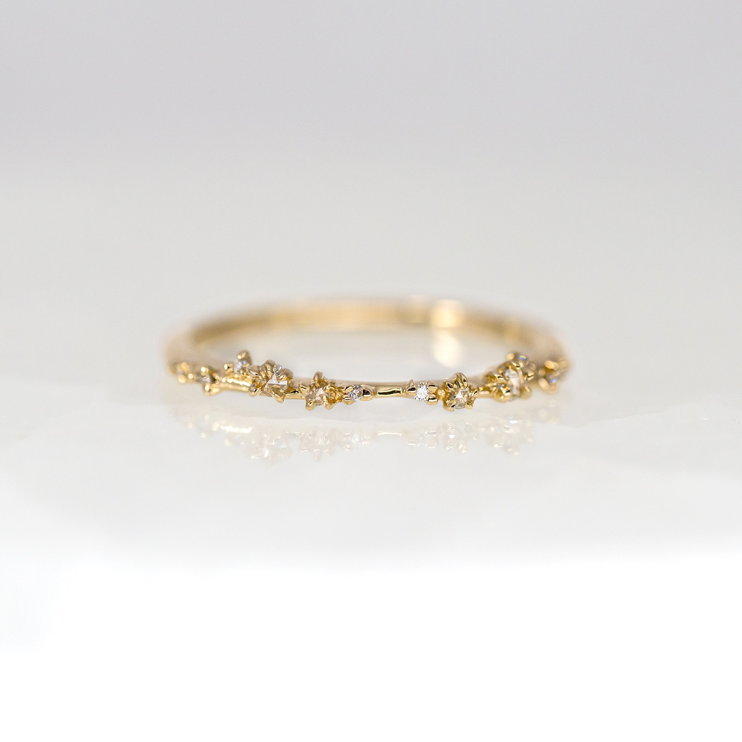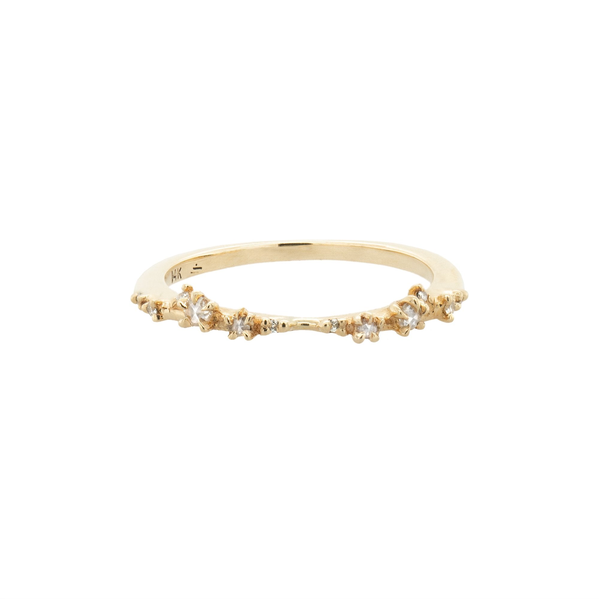 Laurie Fleming White Wisp Diamond band with varying sizes of diamonds in a delicate band. A guiding light, shining a path straight to your heart. The White Wisp with her dancing starlit diamonds, pointing towards a true centre and offering direction for lost souls. A notch in her middle allows space for any centre stone to nest gently, stacking like a dream. Delicately complex on her own, or the perfect transformative pairing with any ring or stack.